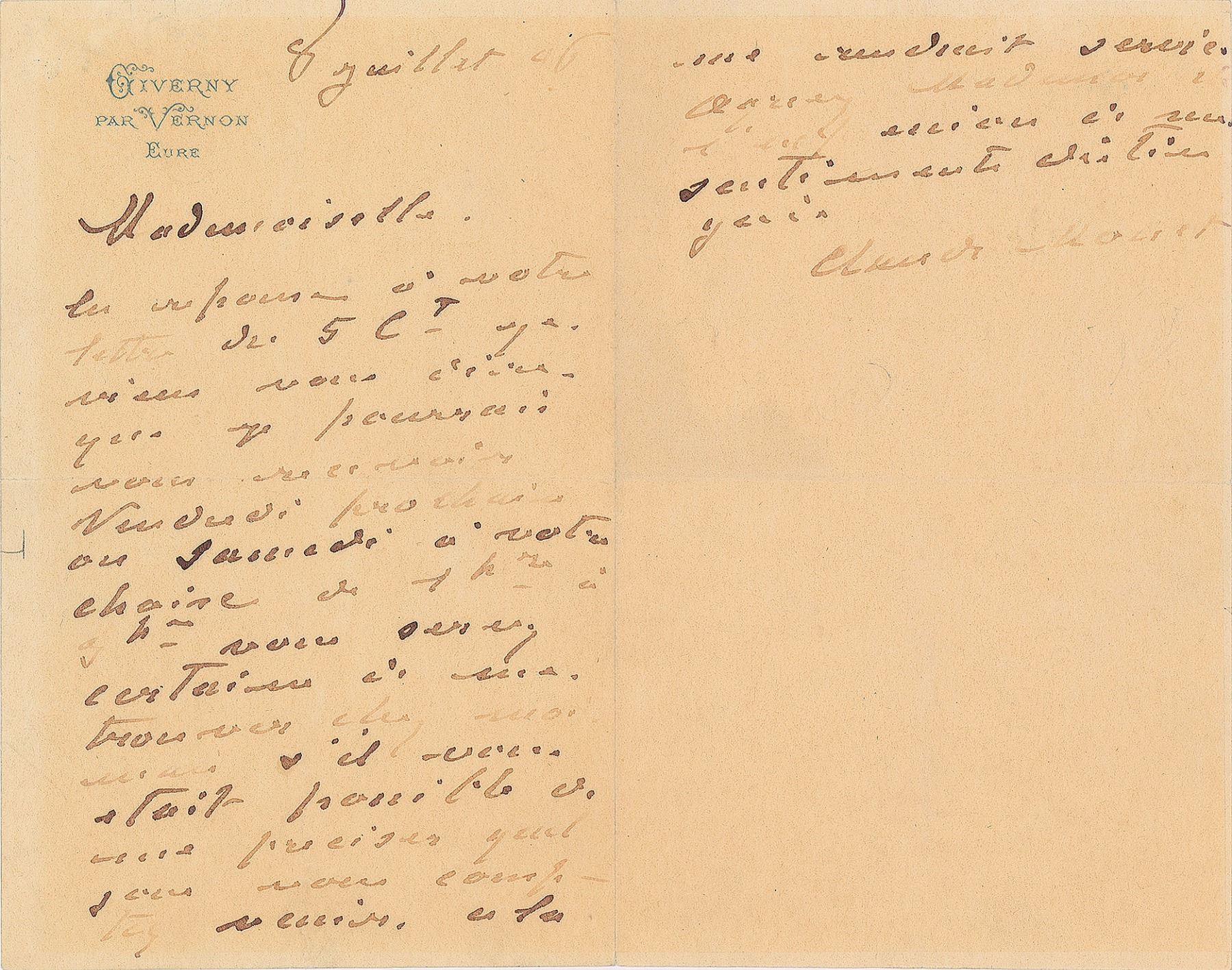ALS in French, two pages on two adjoining sheets, 4 x 6.5, Giverny par Vernon letterhead, July 8, 1906. In full (translated): "Mademoiselle, answer to your letter of the 5th of this month. I am just writing you that I will be able to welcome you next Friday or Saturday as you choose from 1 to 2 o'clock you will be sure to find me at home but if you could possibly let me know the exact day that you intend to come, this would help me." In fine condition, with intersecting folds, slight fading, and light toning. Monet's famous house, gardens, and workshop were in Giverny, where at this time he was working on his series of famous water lily paintings.