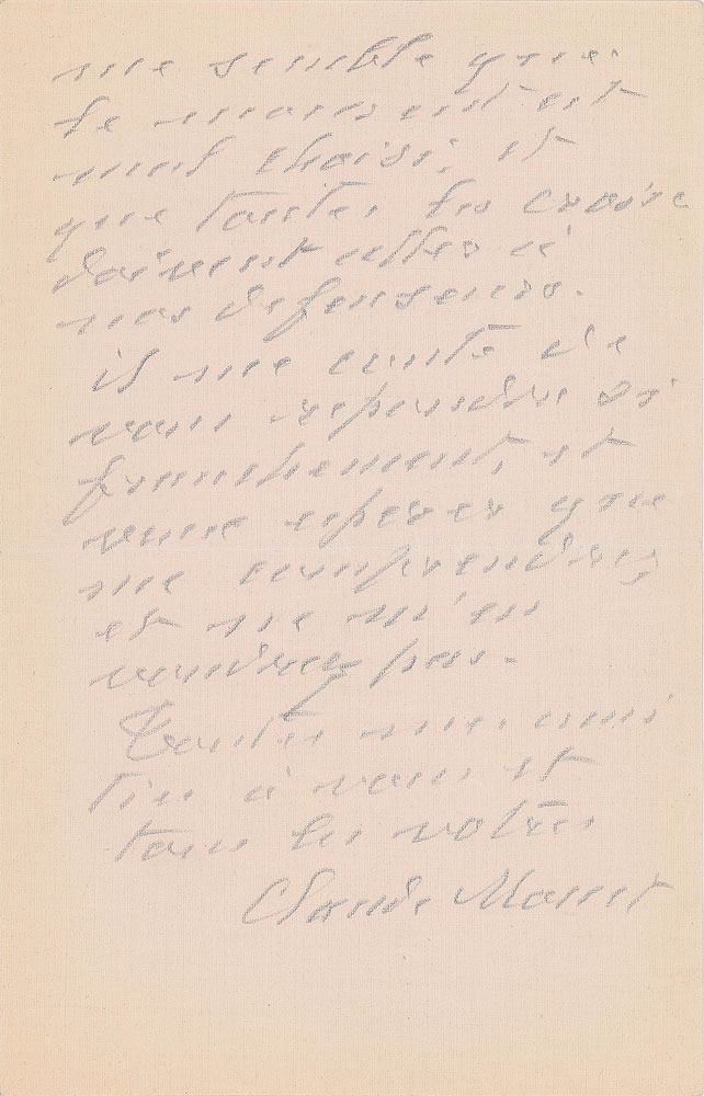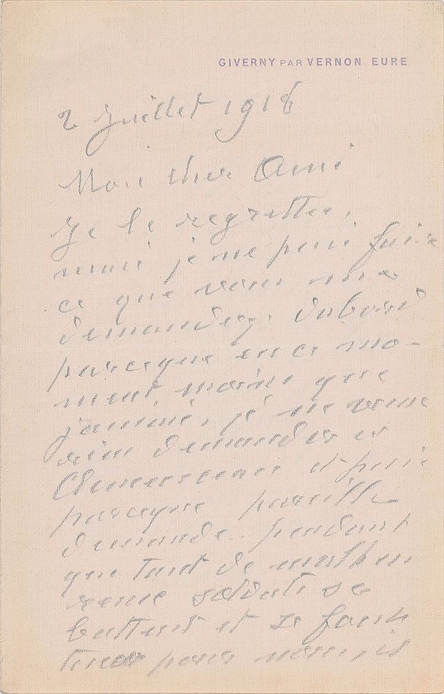 ALS in pencil, in French, two pages on two adjoining sheets, 5.25 x 8, Giverny par Vernon letterhead, July 2, 1918. Beautiful letter evoking Clemenceau and the French soldiers on the battlefields of the First World War. In full (translated): "I am sorry but I can not do what you ask me. First, because now less than ever, I do not want to ask anything of Clemenceau, and also because such an application as so many unfortunate soldiers are fighting and are being killed for us, it seems that the timing is wrong, and all crosses must go to our defenders. It costs me to answer you so frankly and so my hope is that you will understand me and will not mind. All my love to you and all yours." In fine condition.