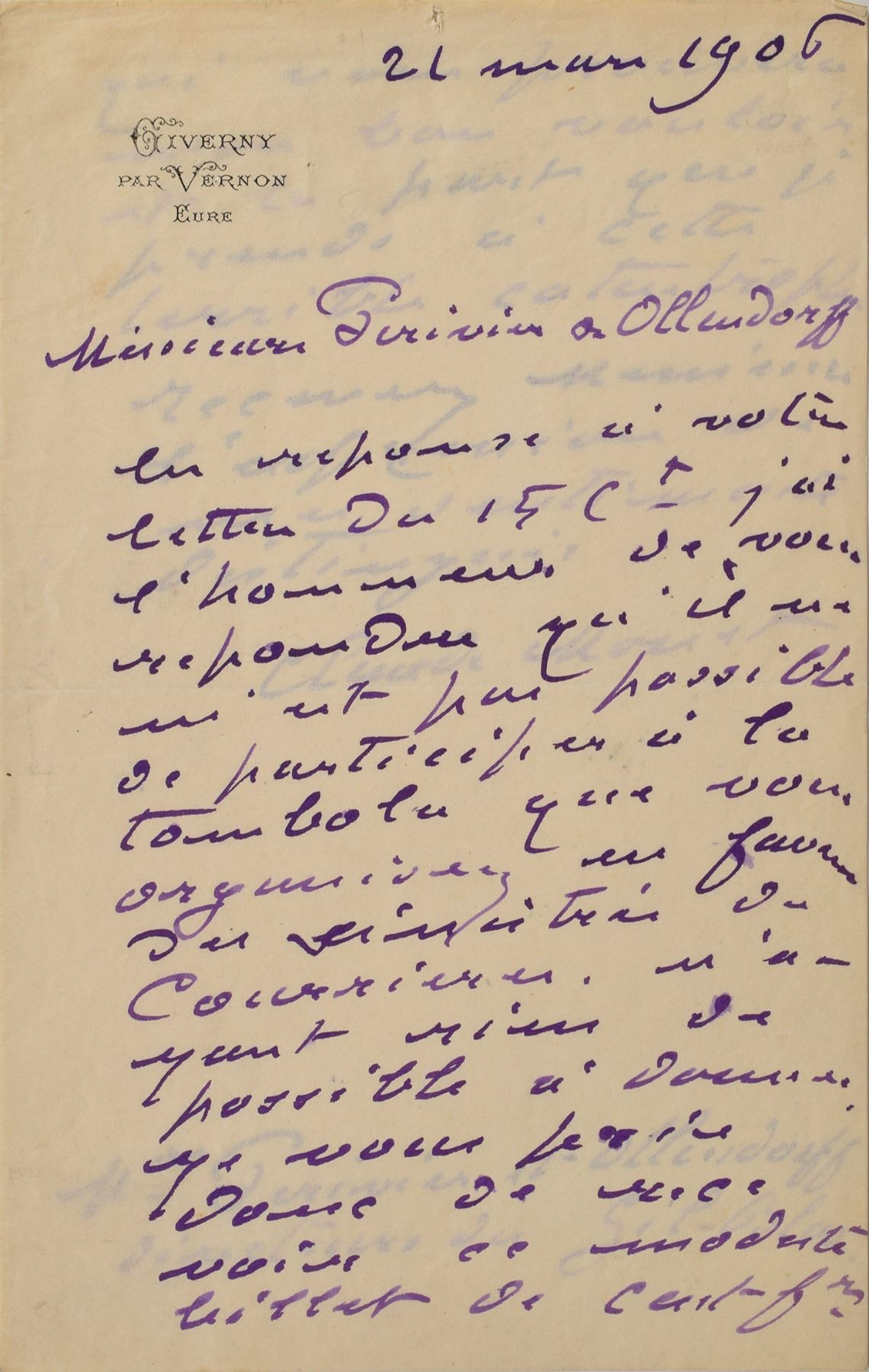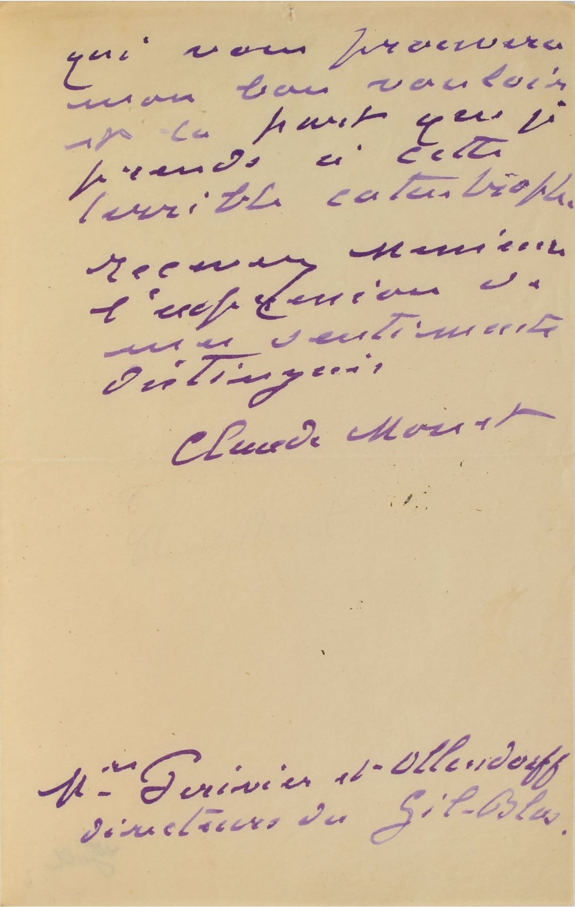 Desirable ALS, two pages on two adjoining sheets, 5.25 x 8.25, Giverny Par Vernon letterhead, March 21, 1906. In part (translated): "In reply to your letter of the 15th of October I have the honor to reply that it is not possible for me to participate in the raffle that you organize in favor of the victims of the Courier and having nothing possible to give, it will do you to receive this modest bill of one hundred francs which will prove to you my good will and the share I take in this terrible catastrophe." In fine condition. On March 10, 1906, the Courrieres mine disaster, Europe's worst mining accident, caused the death of 1,099 miners in Northern France.