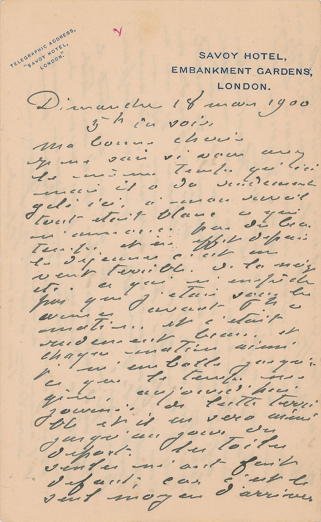 ALS in French, signed “Your old Claude,” four pages on two adjoining sheets, 5 x 8, Savoy Hotel letterhead, March 18, 1900. Letter to his wife Alice, in part (roughly translated): "My good darling, I do not know if you have the same weather like me but it was sharply frozen here. When I woke up everything was white which doesn’t bring good weather, and indeed since the lunch it’s been terribly windy, snowy and so on, which didn’t prevent me from being under the showers before 6 AM this morning, and it was pretty beautiful. Every morning I'm quite excited until the weather embarrasses me. Today was a terrible struggle and it will be so until the day of the departure.