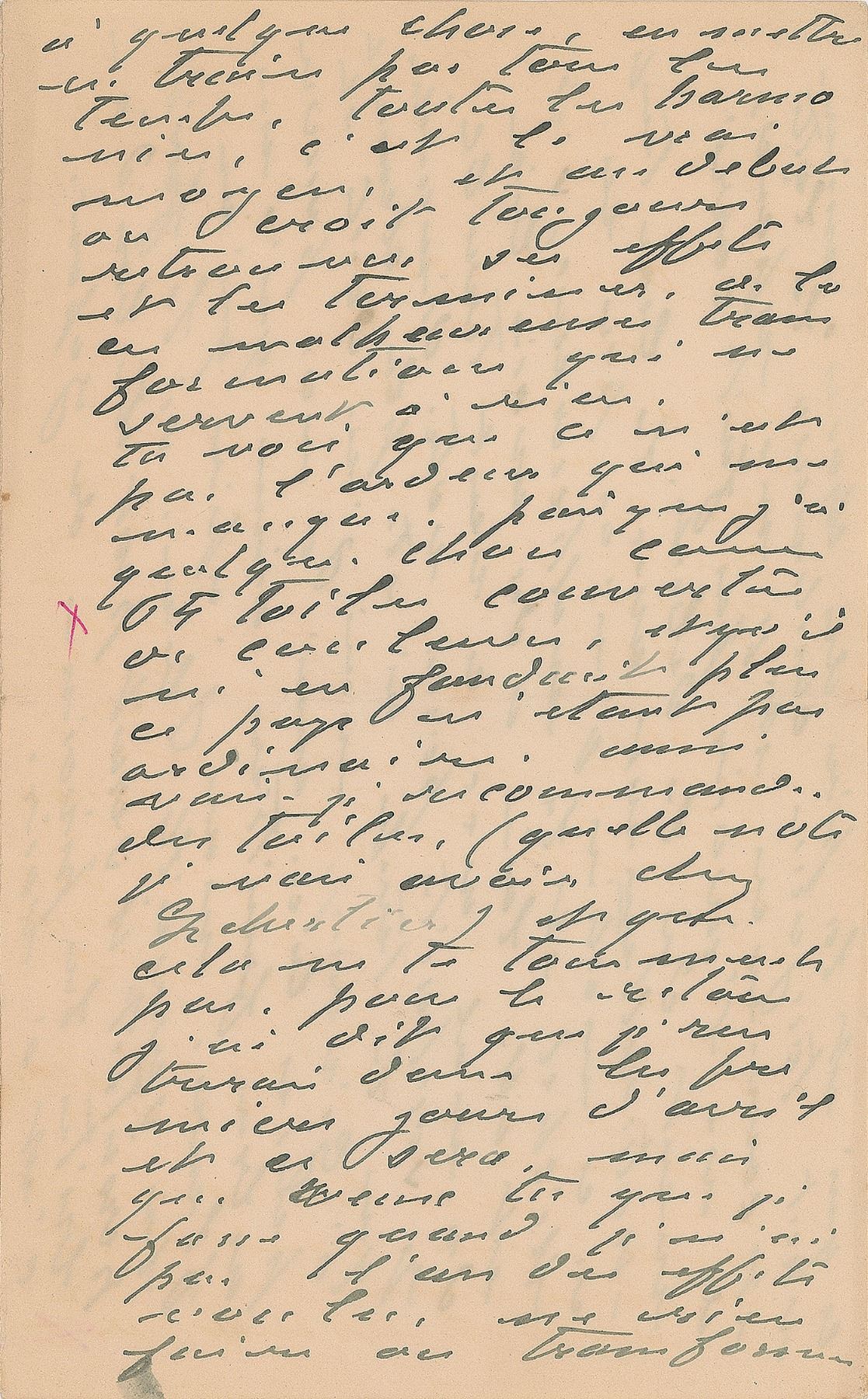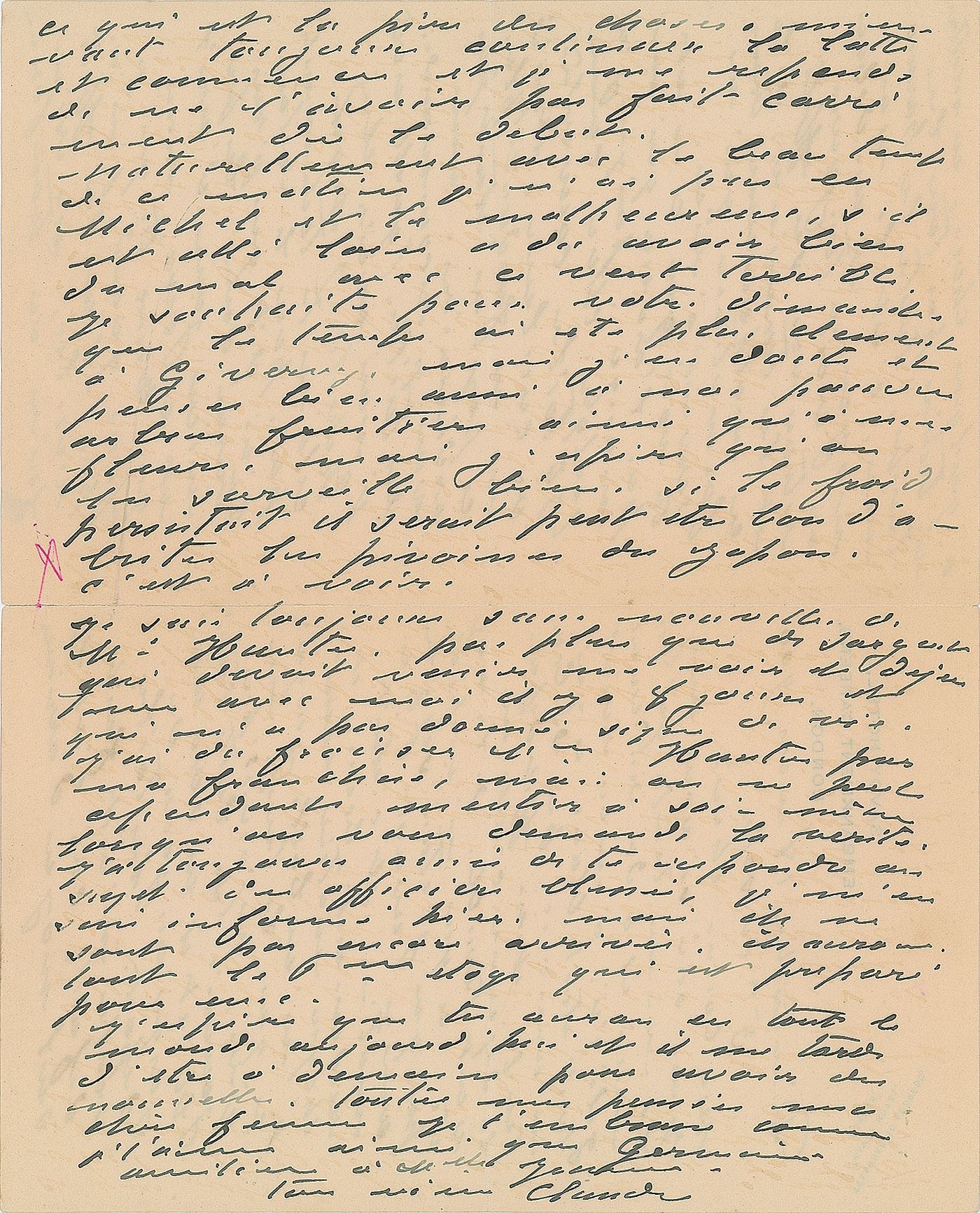 It is always better to carry on the fight and start and I regret that I did not do it right from the start. Of course with the good weather of this morning I did not meet Michel, if he’s gone away he must have had some trouble with this terrible wind. I hope for your Sunday the weather was more lenient at Giverny but I don’t think so. I’m thinking of my poor fruit trees and flowers. But I hope you take care of them. If the cold is going on it might be good to bring back home the peonies of Japan. You have to think of that. I still have no news from Mr. Hunter any more as Sargent [the American painter John Singer Sargent] who came to see me and had lunch with me 8 days ago, and who did not give any sign of life. I must have offended Mrs. Hunter by my frankness. But how can we lie to ourselves when someone asks you the truth? I’ve always wanted to tell you about a wounded officer. I had some news about it yesterday, but they have not arrived yet. They will have all the 6th floor that is ready for them. I hope you have had everyone today and I look forward to seeing you tomorrow. All my thoughts, my dear wife. I kiss you as I love you like Germaine. Say good things to Miss Jeanne." In fine condition.