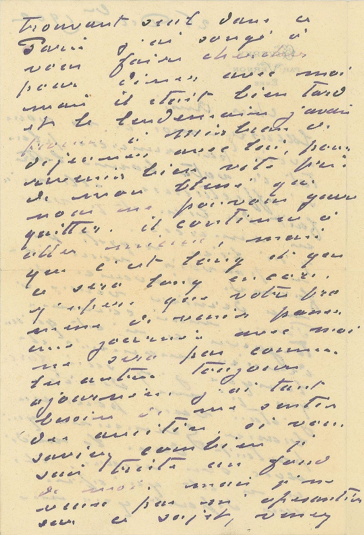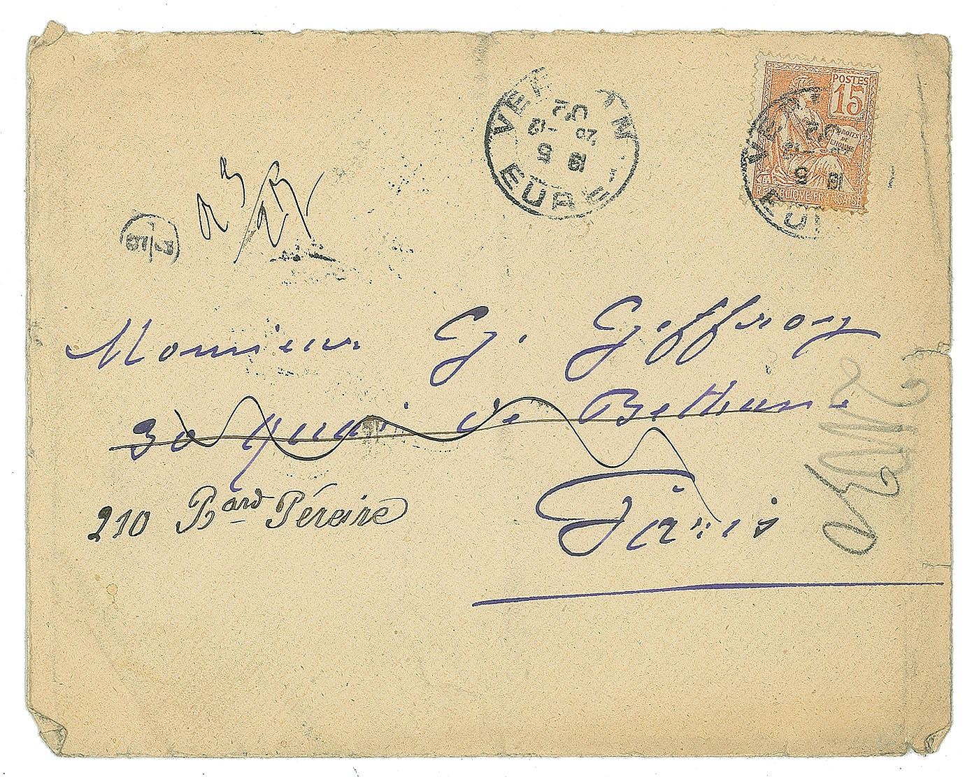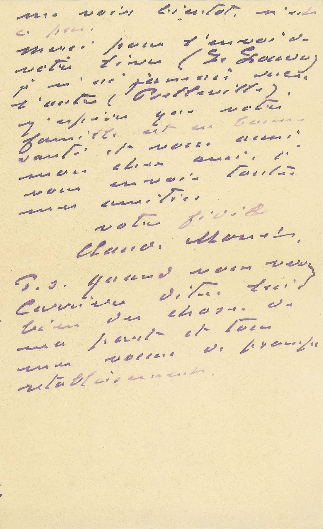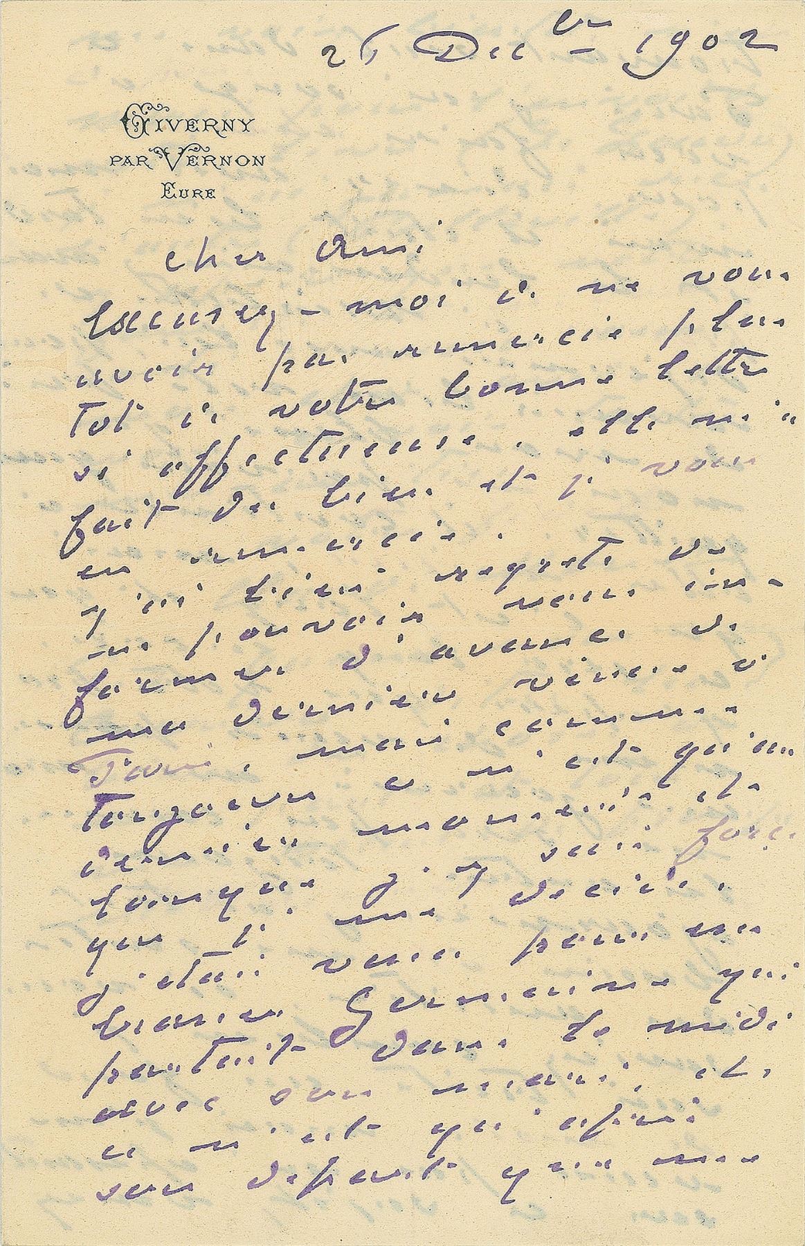 ALS in French, three pages on two adjoining sheets, 5.25 x 8.25, December 25, 1902. Letter to influential art critic and author Gustave Geffroy, in which he thanks Geffroy for his letter and apologizes for missing him when he was recently in Paris. Monet discusses family matters, thanks Geffroy for sending him his book Le Louvre, and mentions that he never received a copy of his previous book Belleville. In a postscript, Monet asks Geffroy to wish the painter Carriere well and to send his regards for a speedy recovery. In fine condition. Accompanied by the original mailing envelope, addressed in Monet's own hand. Geffroy was a founding member of the literary organization Academie Goncourt in 1900 and is noted as one of the earliest historians of the Impressionist movement. He championed Monet after meeting him in Belle-Ile-en-Mer in 1886, where Monet busied himself painting the local oceanside rock formations, works which astounded the Paris art world when first exhibited in 1887.