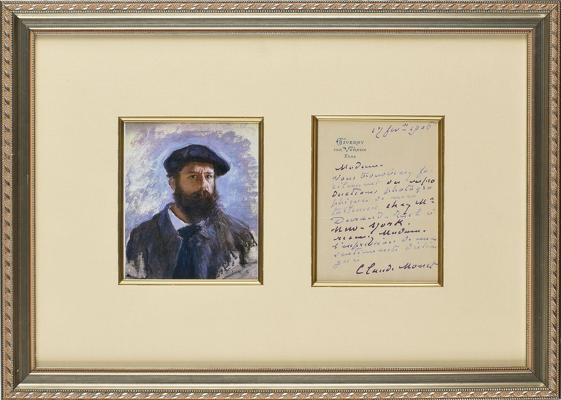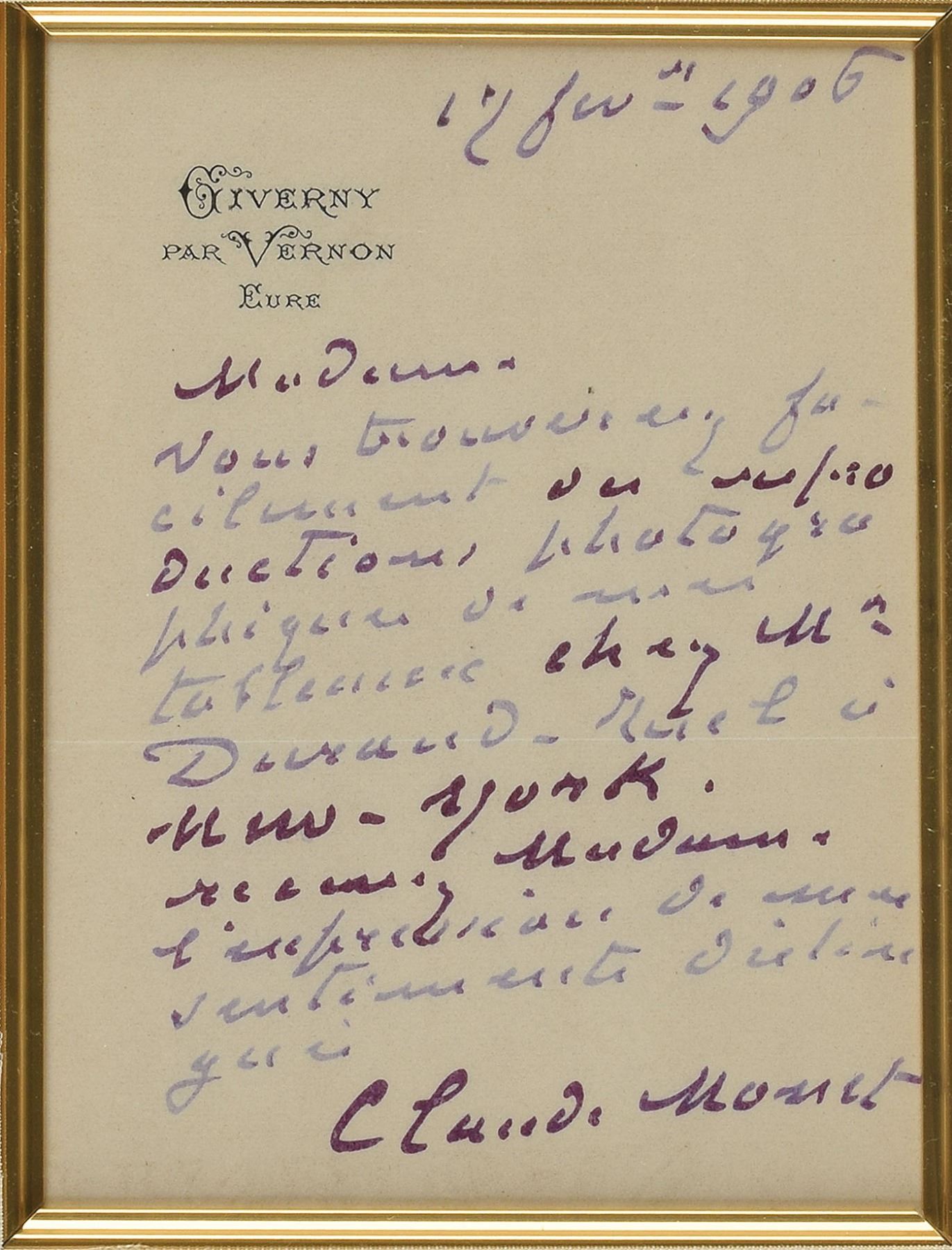 ALS in French, one page, 4 x 5, Giverny par Vernon letterhead, February 17, 1906. Letter mentioning his famous art dealer Durand-Ruel, in full (translated): "You will easily find some photographic reproductions of my paintings at Mr. Durand-Ruel in New York." Archivally cloth-matted and framed with a self-portrait print to an overall size of 17.5 x 12.5. In fine condition.
