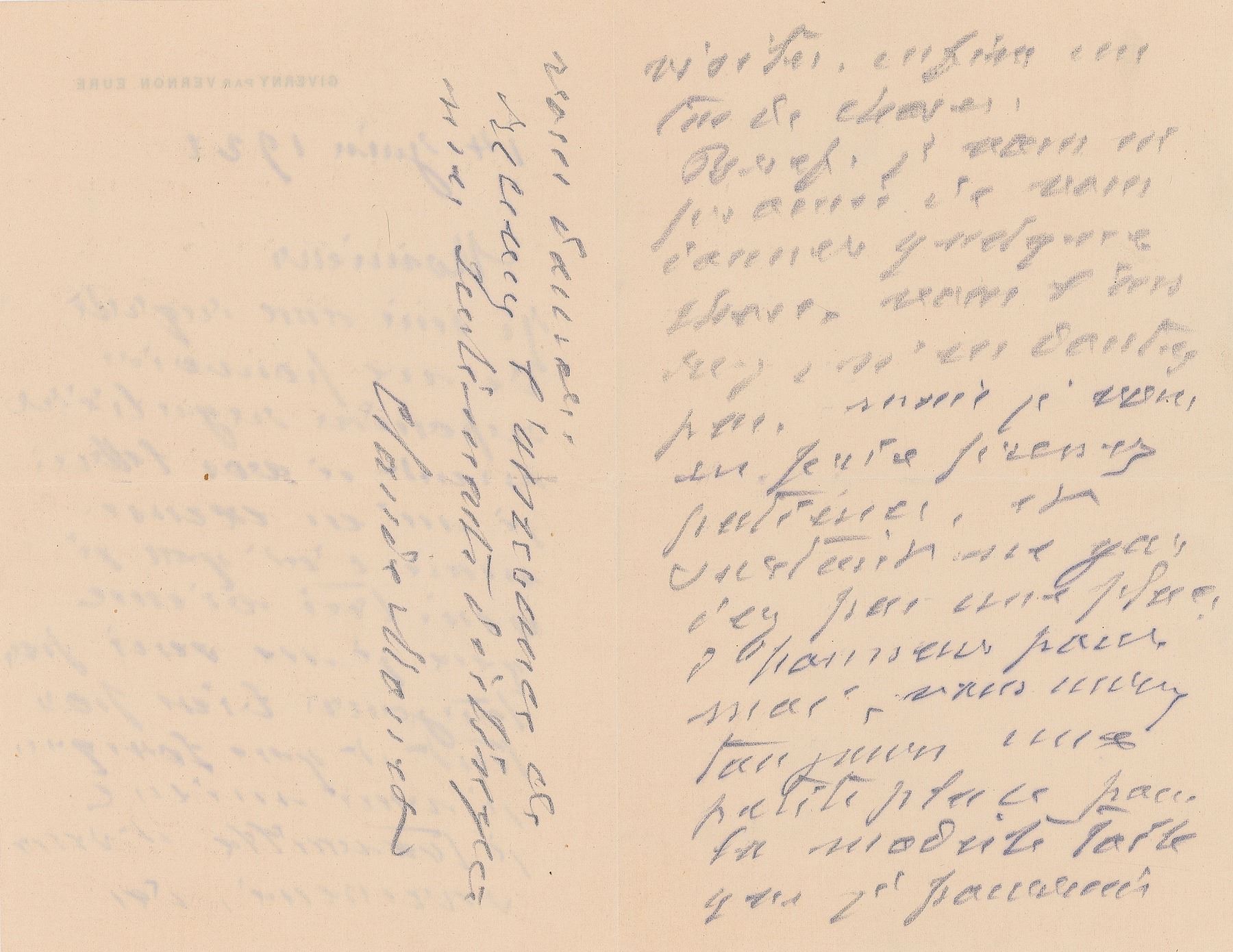 ALS in French, three pages on two adjoining sheets, 5.25 x 8, Giverny par Vernon letterhead, June 14, 1921. Untranslated letter in pencil, written from his famous Giverny gardens. In fine condition.