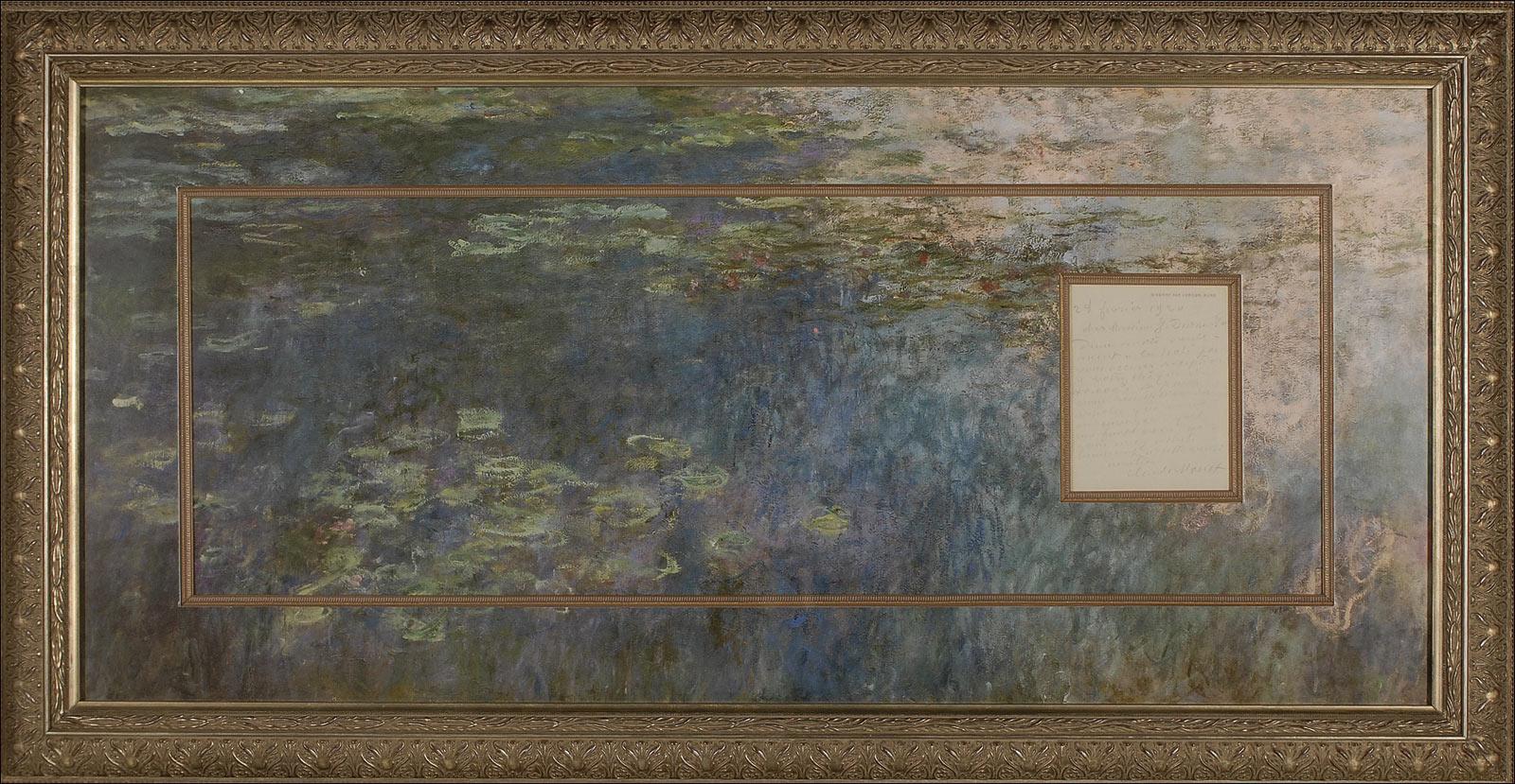 Highly influential French painter (1840–1926) who was among the leading figures of the impressionist movement, which took its name from the title of one of Monet’s works. ALS in French, one page, 4.5 x 5.75, personal letterhead, February 28, 1920. Letter to “Sir of Duruer Tres”. In full: “Just a note to acknowledge the receipt of your check of 40,000 francs and to thank you for the articles that you sent me which I will inspect. You have bought a lot at this sale.” Impressively double gilt matted and framed inside a print of one of his works to an overall size of 42 x 22. In fine condition, with a few lines of text a shade or two light, but all completely legible. Oversized.
