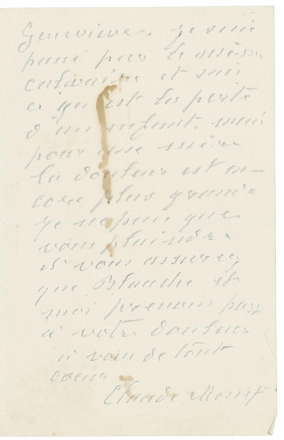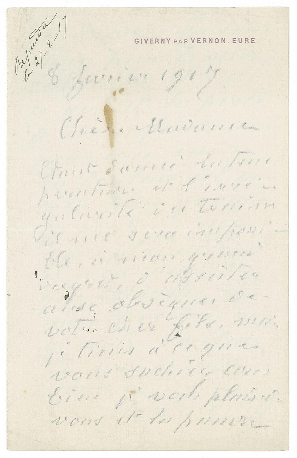 ALS in French, in purple pencil, two pages, 5.25 x 8.25, Giverny Par Vernon Eure letterhead, February 8, 1917. Letter to an unidentified woman. In full (translated): “Because of the temperatures and the irregular…it will be impossible for me to be at your dear son’s funeral, but I wanted you to know how I feel for you and poor Genevieve. I went through similar calamities and I know what it feels like to lose a child, but for the mother the pain is even greater. I can only feel sorry for you and assure you that Blanche and I share in your sorrow.” In very good condition, with some mild wrinkling and creasing, thin vertical stains to both pages, one affecting first name of signature, “received” notation to top left, and all writing a shade light, but still completely legible.
