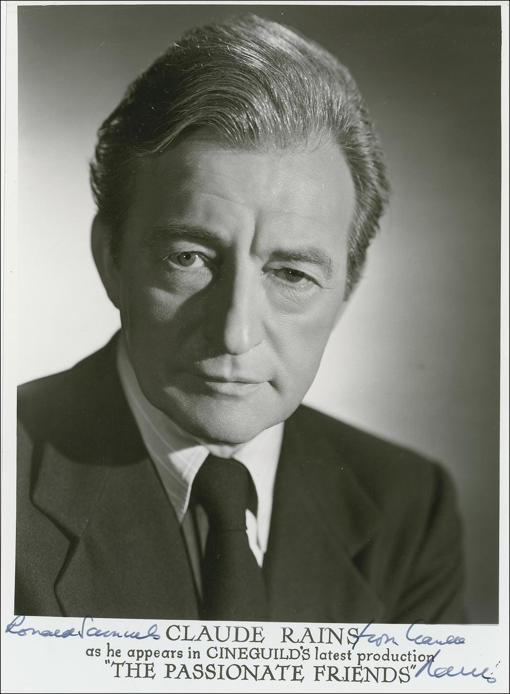 Vintage glossy 7.25 x 10 promotional photo of Rains as he appears in The Passionate Friends, signed and inscribed in fountain pen “Ronald, Samuels from Claude Rains.” In fine condition, with a few scattered light surface marks and dings.