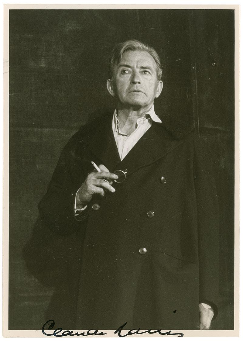 Matte-finish 5 x 7 photo of an older Rains holding a cigarette, signed in black ink. In fine condition, with surface scratch and a few other light surface impressions.