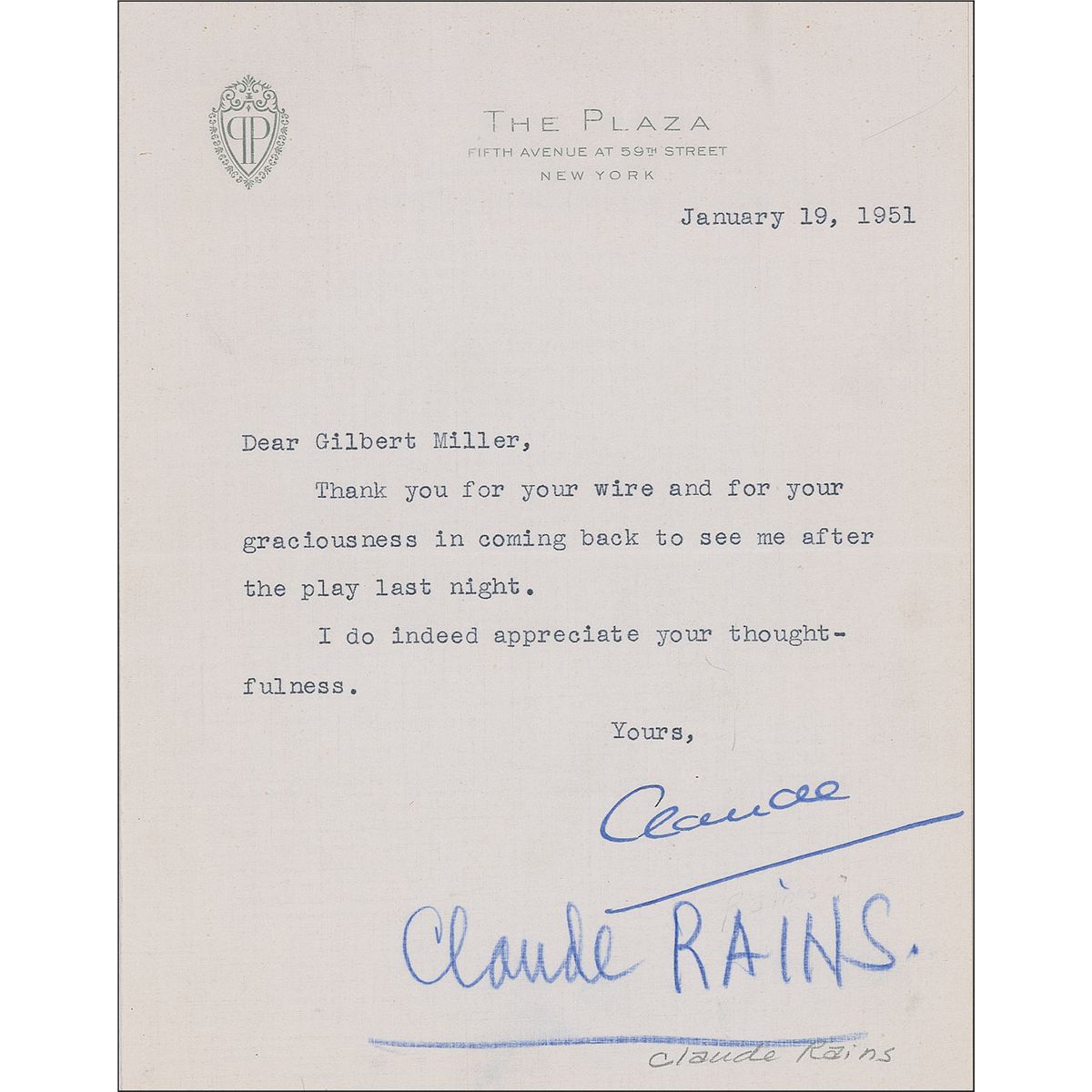 TLS signed “Claude,” one page, 5.75 x 7.5, Plaza Hotel letterhead, January 19, 1951. Rains sends thanks to multiple-Tony-winning producer Gilbert Miller (1884–1969), for “coming back to see me after the play last night.” In fine condition, with blue pencil notation near but not touching Rains’ signature. The actor had recently opened on Broadway in Darkness at Noon, for which he won the Tony for Best Actor.