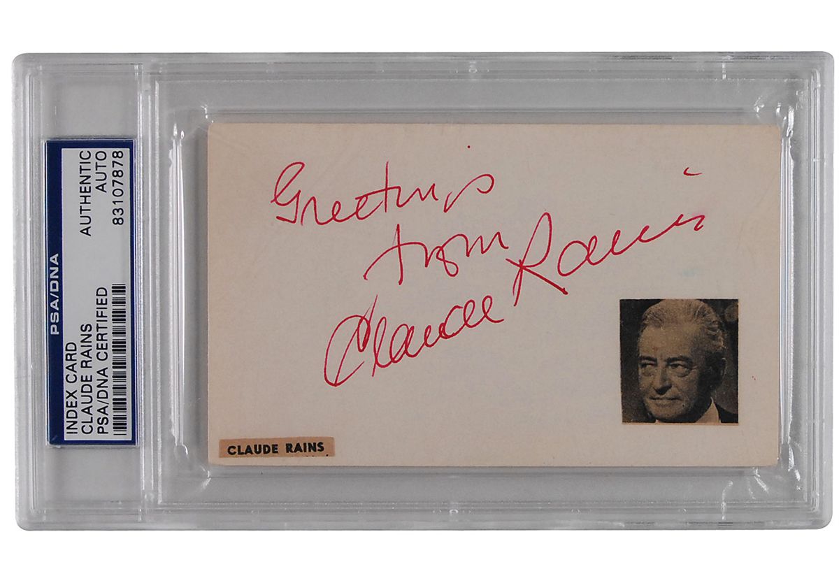 Vintage fountain pen signature, “Greetings, from Claude Rains,” on an off-white 5 x 3 card bearing an affixed magazine photo. Encapsulated in a plastic PSA/DNA authentication holder. In fine condition.