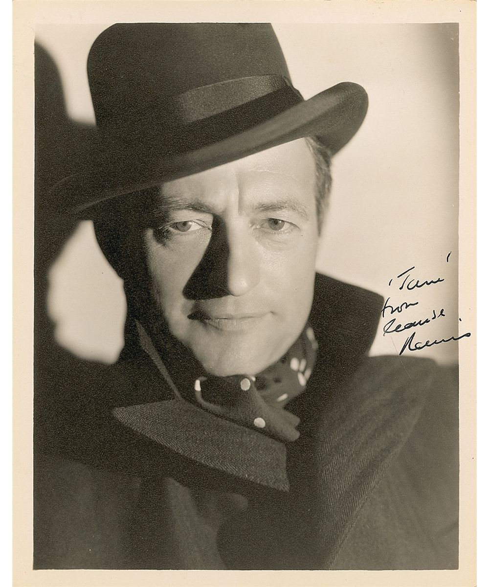 Vintage matte-finish 8 x 10 photo of Rains in a black bowler and overcoat, signed and inscribed in fountain pen, “‘Jane’ from Claude Rains.” In fine condition.