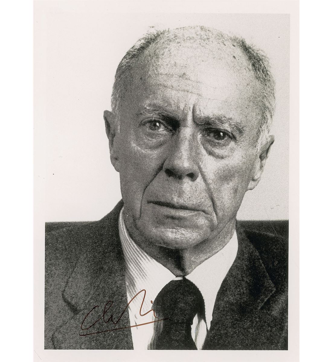 French novelist (1913–2005) who received the Nobel Prize in Literature in 1985. Glossy 7 x 9.5 portrait of Simon, signed in brown felt tip. In fine condition, with light contrast to a portion of the signature against his dark jacket.