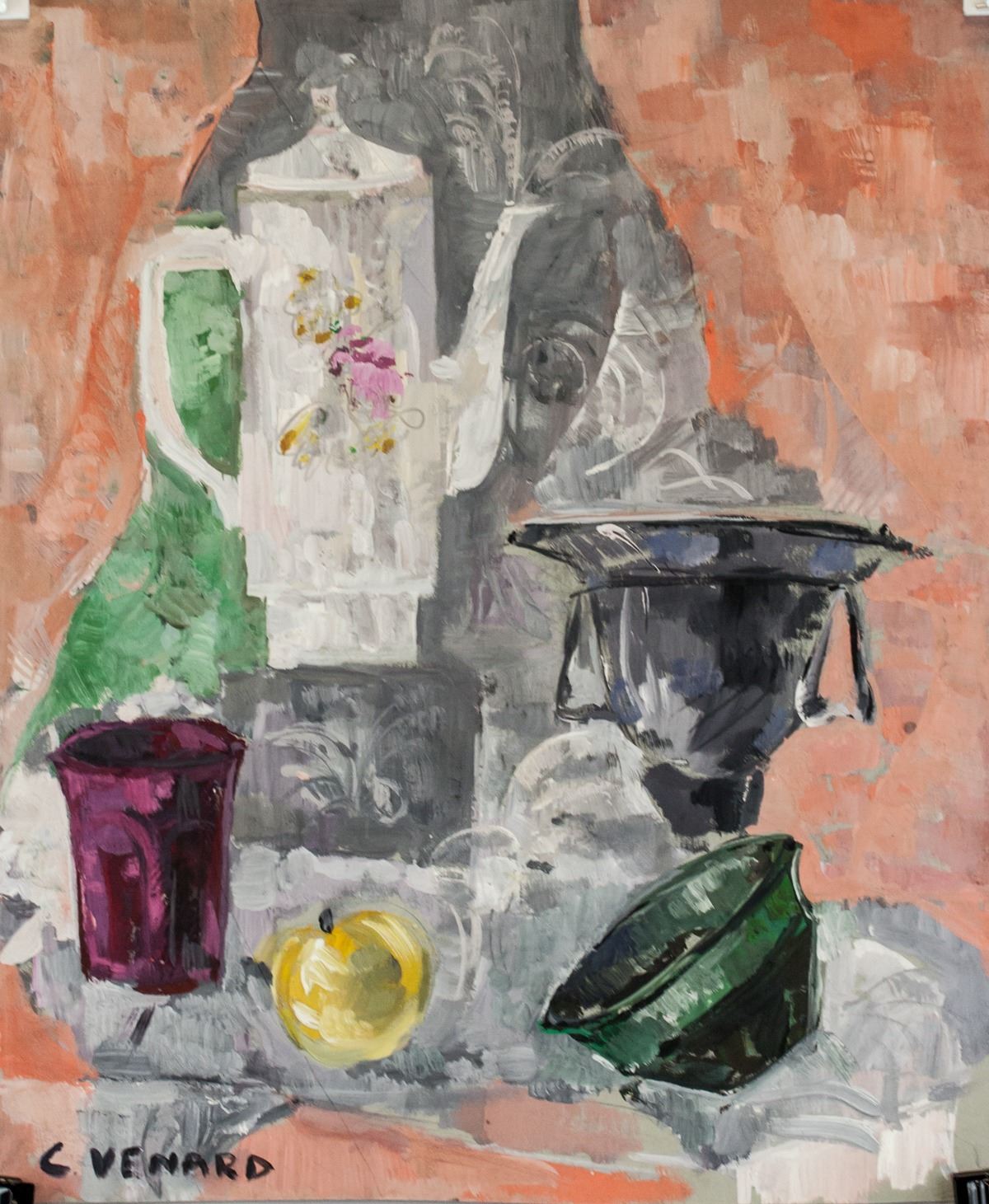 Oil on paper. Featuring a cubist still of fruits, cups and vases. Signed C VENARD on the lower left corner. Attributed to Claude Venard (1913-1999, French). 56 x 46 cm (22 x 18.1 inches). PROVENANCE: Upper New York estate