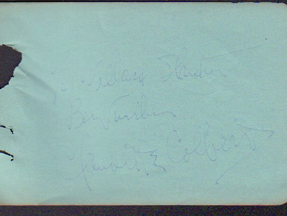 Autograph book page signed by Claudette Colbert. It was inscribed to Willard Slawter. All items come with a certificate of authenticity good for the life of the piece.