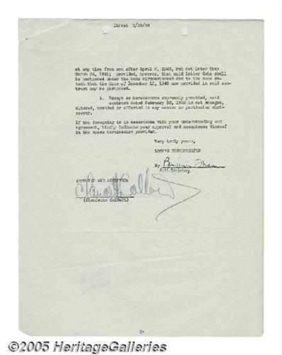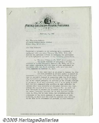 <B>Claudette Colbert Signed Contract.</B></I> A two-page employment contract on MGM letterhead, dated February 20, 1939, signed by Golden Age, Oscar-winning starlet Claudette Colbert on the last page in black ink. In very good condition, with virtually no fading, edge wear, or discoloration; only the usual staples and binder holes. <I>With COA from PSA/DNA.</B></I>
