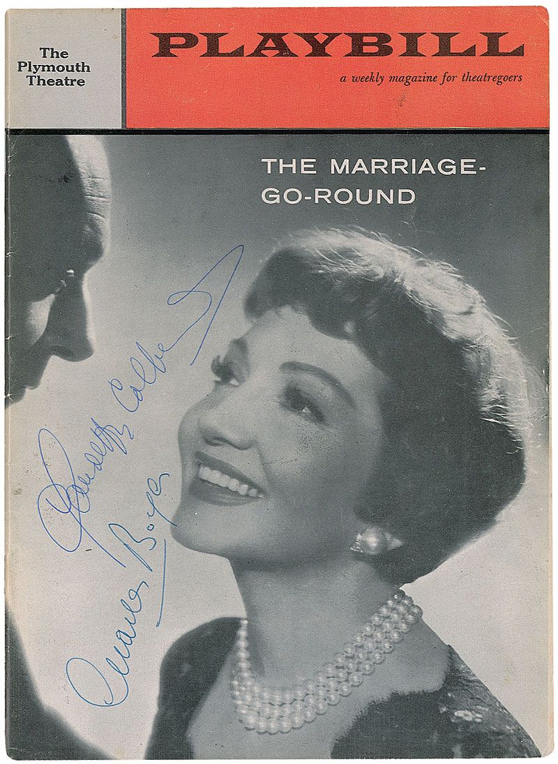 Playbill for the Plymouth Theatre production of The Marriage-Go-Round in October 1958, 6.5 x 9, 52 pages, signed on the front cover in blue ballpoint by Colbert and Boyer. In fine condition.