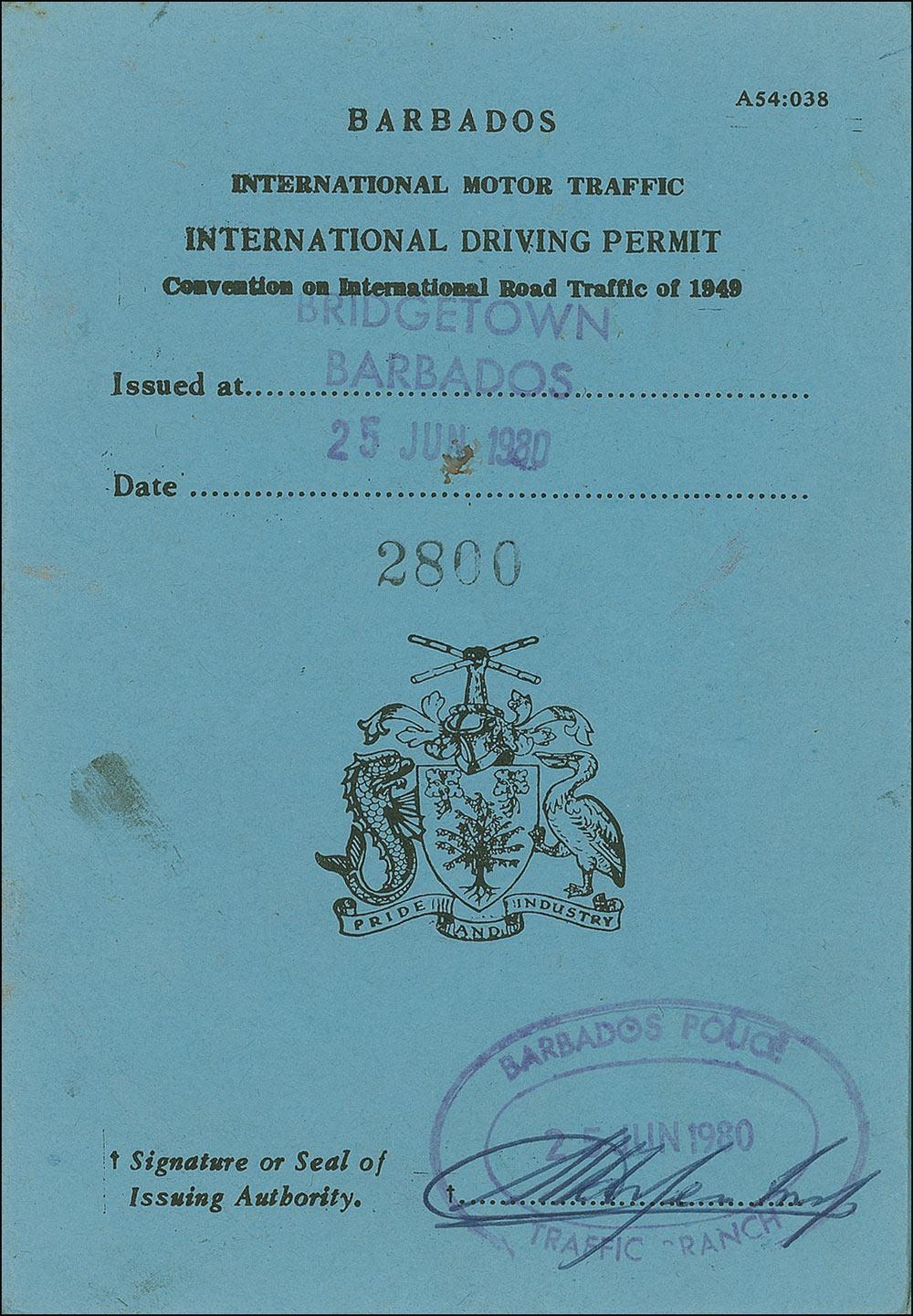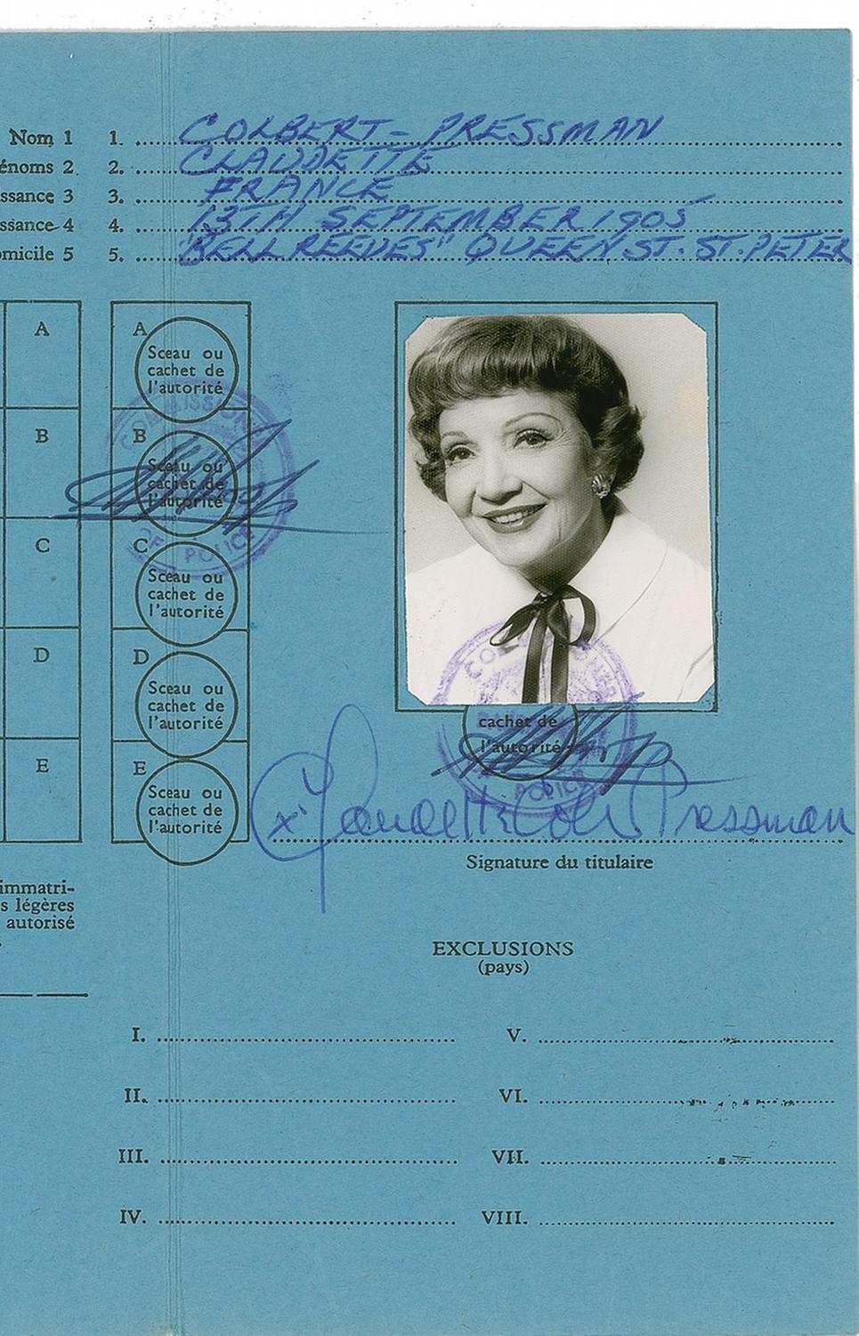 Colbert’s Barbados international driving permit, issued on June 25, 1980, 4.25 x 6.25, issued by the Barbados Police Traffic Branch. Fold-out back cover bears a 1.5 x 1.75 clipped snapshot, signed underneath in blue ballpoint, “Claudette Colbert-Pressman,” with her personal information filled out in another hand, including her birth date and residence. In fine condition, with official stamp over small portion of photo and signature, and expected light handling wear. Colbert’s residence listed in the permit “Bell reeves” was her summer home for years, and she spent her final years there after suffering several strokes.