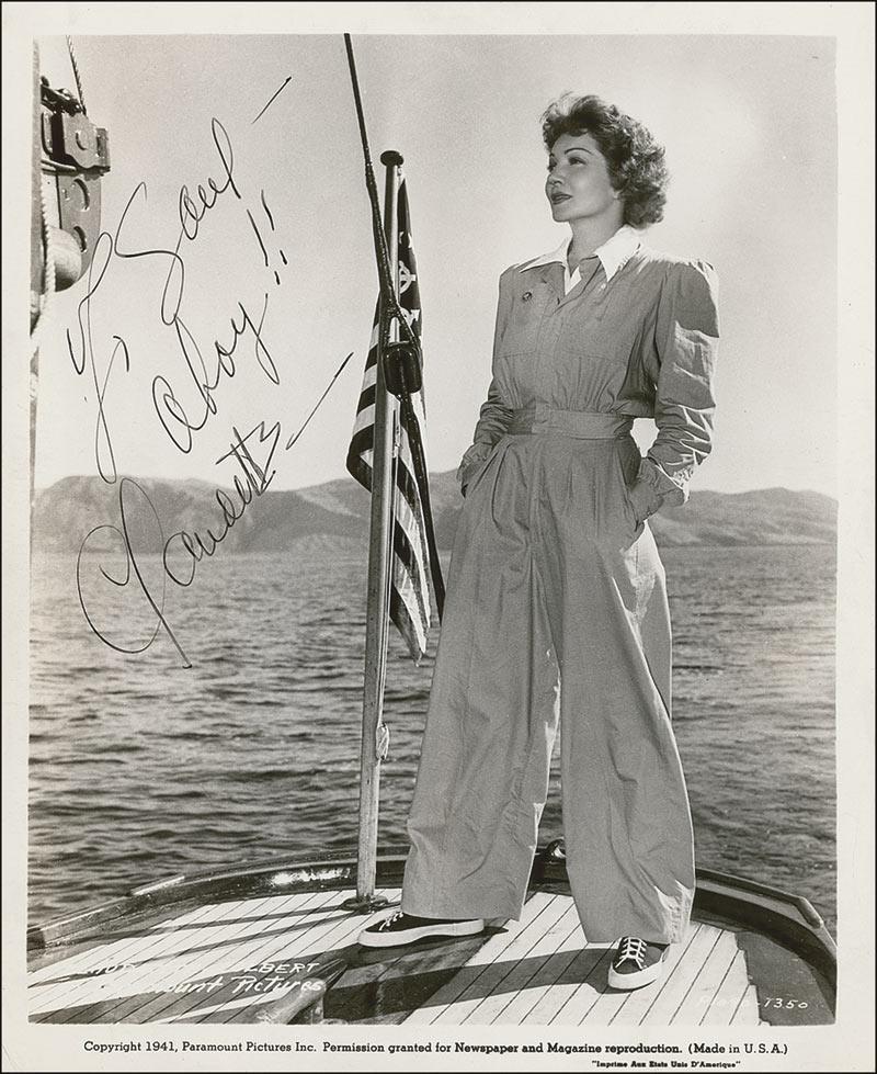 Vintage glossy 8 x 10 Paramount Pictures publicity photo of Colbert standing on the bow of a ship, signed and inscribed in fountain pen “To Saul–Ahoy! Claudette.” Reverse of photo bears collector’s ink date notation of September 24, 1954, the date the signature was acquired. Some scattered light creases and surface marks, mild rippling to emulsion, and a bit of light silvering to darker areas, otherwise fine condition. Saul Goodman Collection.