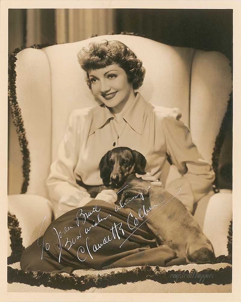 Vintage matte-finish 8 x 10 photo of Colbert sitting in a parlor chair with a dog in her lap, signed and inscribed in white ink “To Joan Bruce—Best wishes always, Claudette Colbert.” In fine condition, with a bit of scattered trivial silvering.