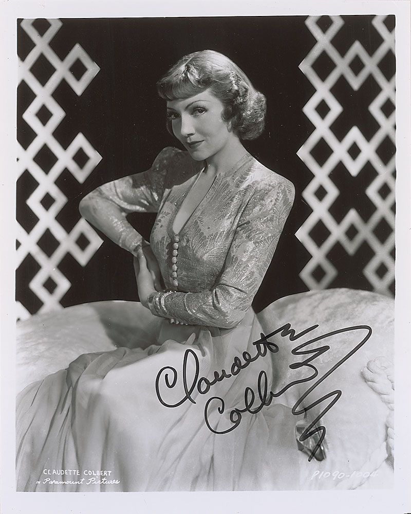 Glossy 8 x 10 photo of Colbert in a formal gown, signed in black felt tip. In fine condition, with a couple creases and a tiny tear to top edge.