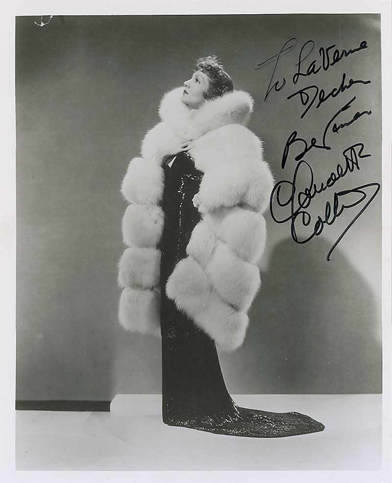 Glossy 8 x 10 full-length photo of Colbert in a sequined dress and ostentatious fur cape, signed and inscribed in black felt tip, “To LaVerne Decker, Best Wishes, Claudette Colbert.” In fine condition.