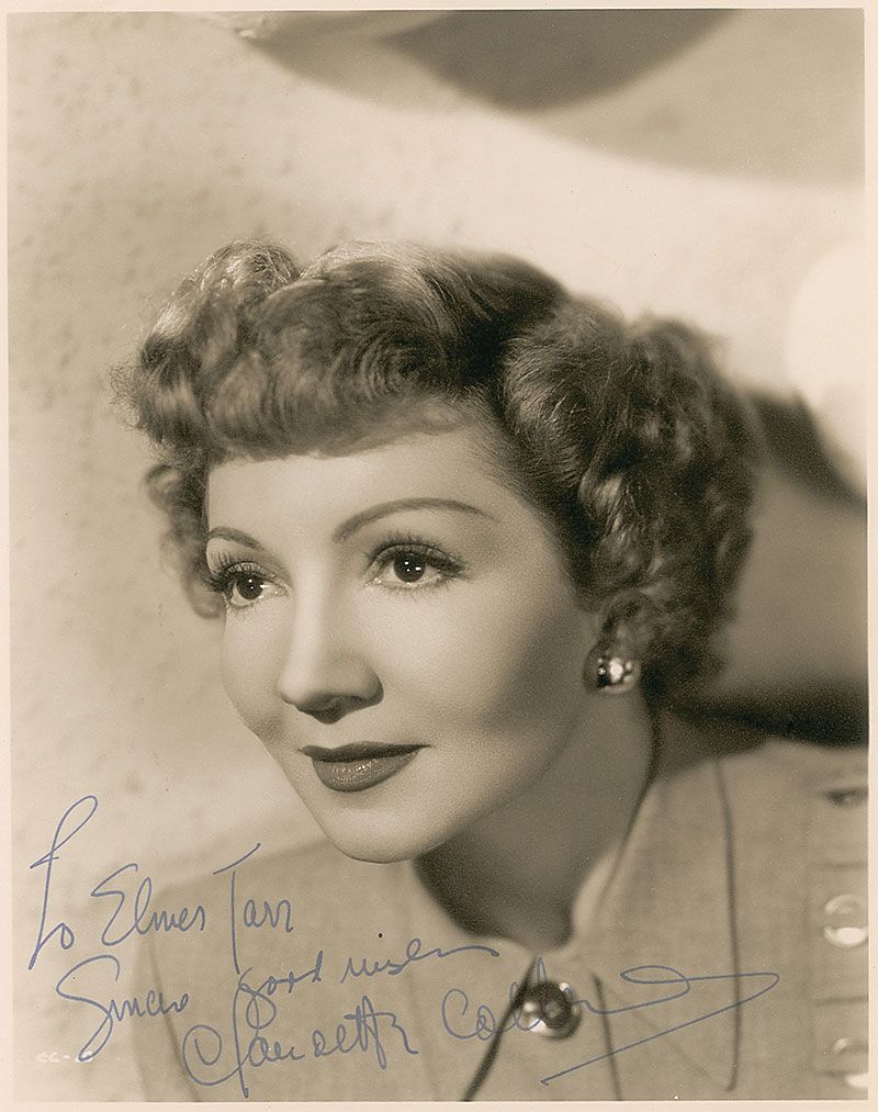Lovely vintage matte-finish 7.25 x 9.25 head-and-shoulders photo, signed and inscribed in fountain pen, “To Elmer Tan, Sincere good wishes, Claudette Colbert.” In fine condition, with slightly trimmed edges.