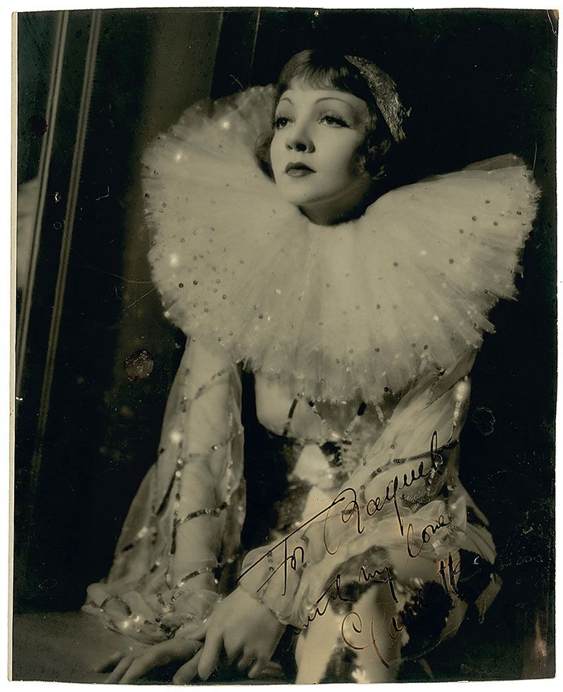 Vintage glossy 10 x 12.5 double-weight Paramount publicity photo of Colbert in costume from the 1933 film Tonight Is Ours, signed and inscribed in fountain pen, “To Raquel, with my love, Claudette.” In very good condition, with trimmed edges, scattered spotting, surface marks, and soiling, and moderate contrast to portions of inscription and signature.
