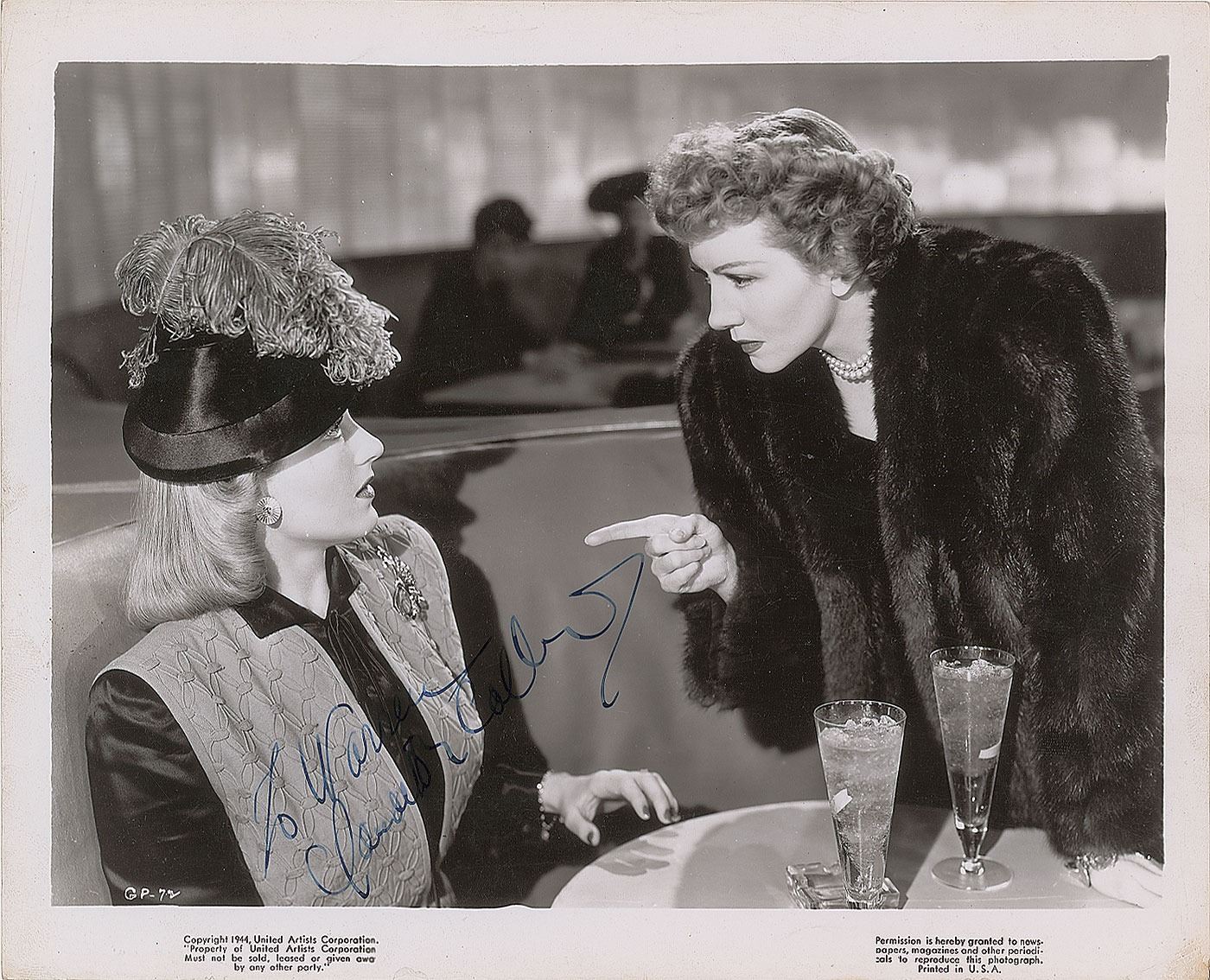 Vintage glossy 10 x 8.25 United Artists publicity photo of a movie scene with Colbert wearing a fur coat and casting an accusatory finger, signed and inscribed in fountain pen, "To Warren, Claudette Colbert.” In fine condition.