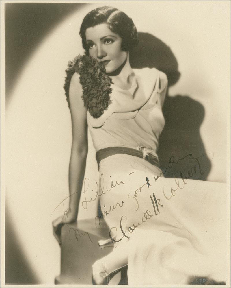 Alluring vintage matte-finish 8 x 10 Richee photo, signed and inscribed in fountain pen “For Lillian—My sincere good wishes, Claudette Colbert.” A few light creases, last name of signature just a shade light, and a bit of scattered light silvering, otherwise fine condition.