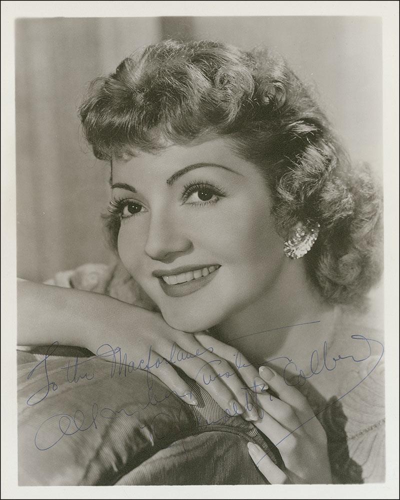 Vintage matte-finish 8 x 10 portrait of a smiling Colbert, signed and inscribed in blue ink “To the Macfarlanes—All my best wishes, Claudette Colbert.” In fine condition.