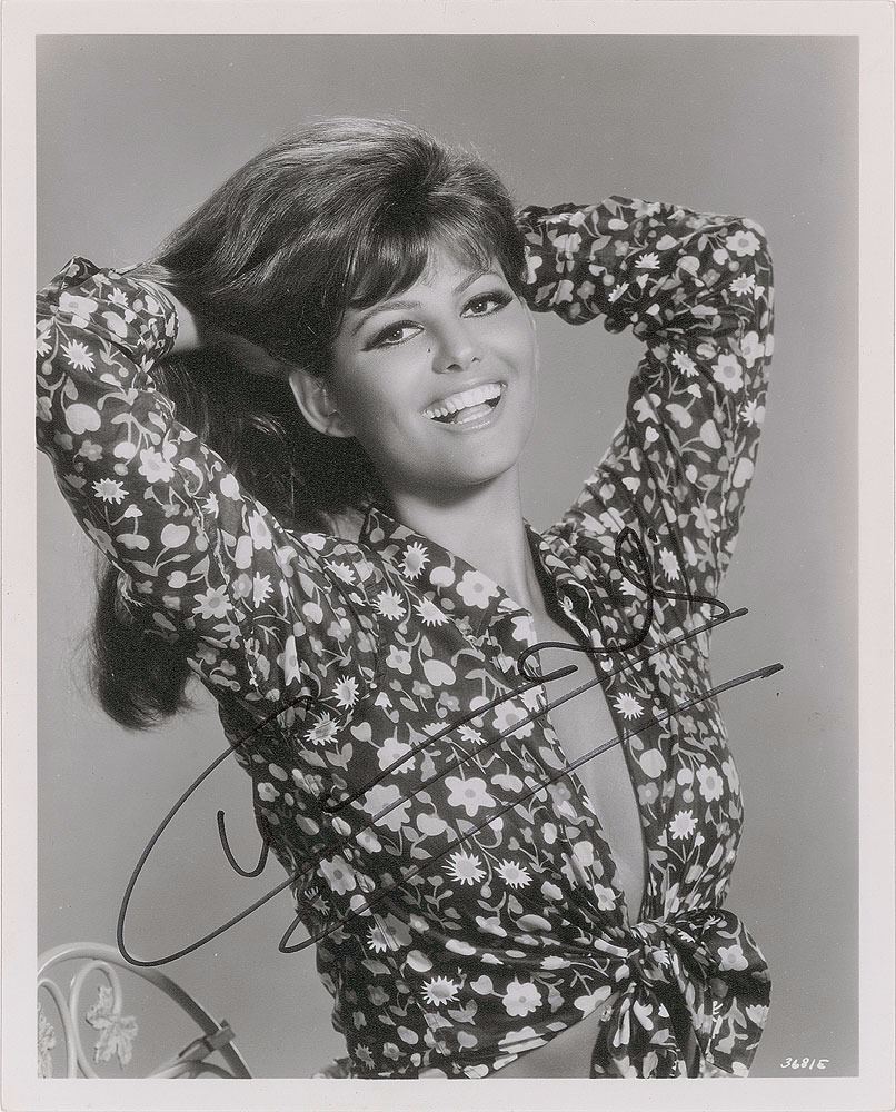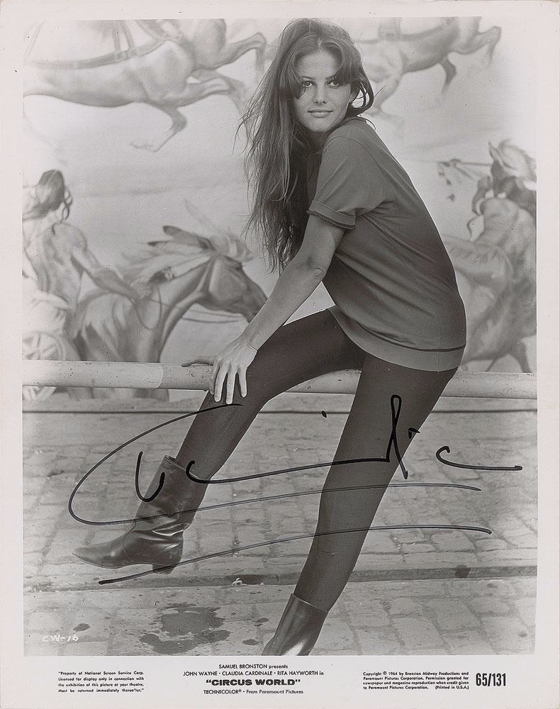 Two photos: a matte-finish 8 x 10 studio portrait of Cardinale, signed in black felt tip, with reverse bearing an MGM/Filmways stamp for the 1967 film Don't Make Waves; and a glossy 8 x 10.25 Paramount Pictures publicity photo of Cardinale for her upcoming role as Toni Alfredo in the 1964 film Circus World, signed in black felt tip. In overall fine condition. From the Harvey and Rhoda Kuflik Collection.