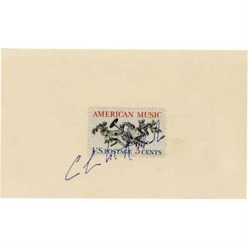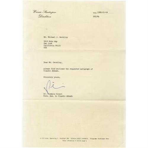 <B>Claudio Abbado Autograph.</B></I> A 5" x 3" card, with a five-cent commemorative postage stamp affixed, signed by the celebrated Italian conductor in dark blue ink. The signature extends across the face of the stamp. Accompanied by a letter from Abbado's personal assistant regarding the autograph, dated 1988. In Excellent condition.<BR><BR><b>Shipping:</b> Flat Material, Small (<a target="_blank" href="http://www.heritageauctions.com/common/shipping.php">view shipping information</a>)