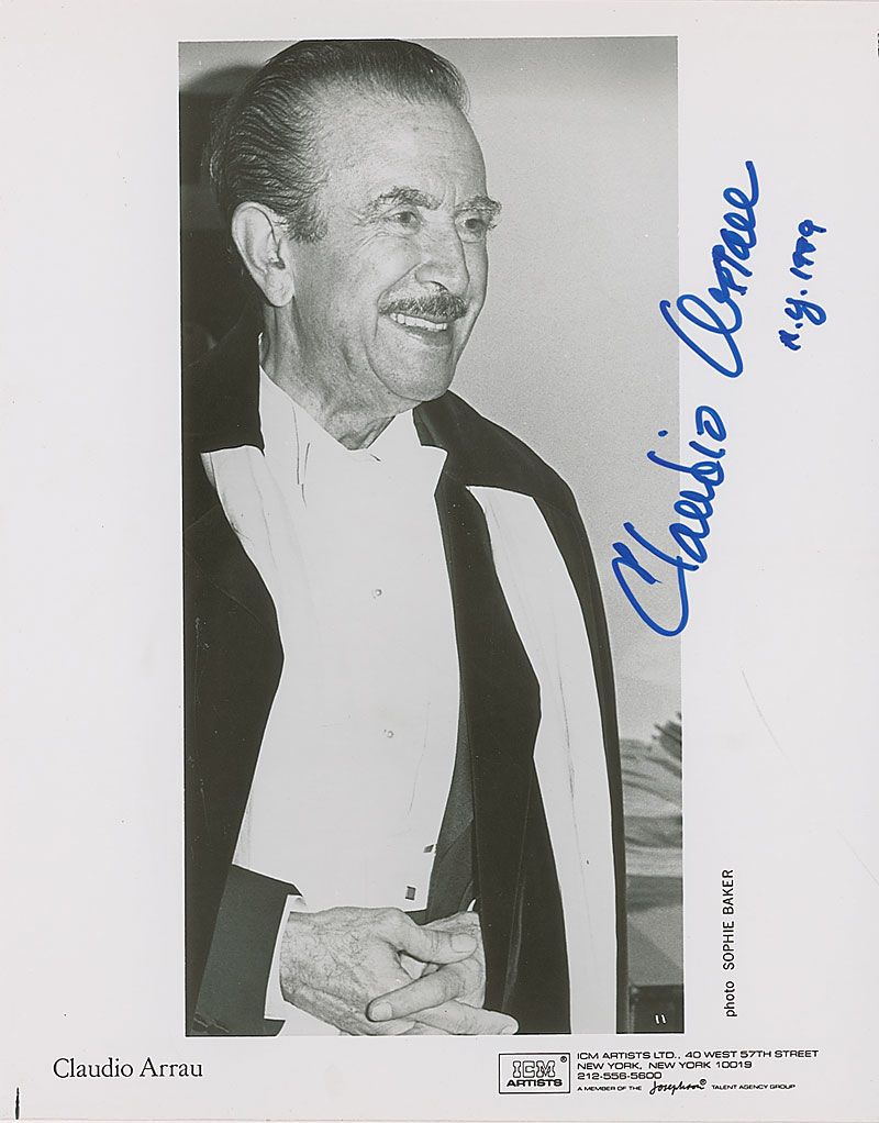 Glossy 8 x 10 publicity photo of the pianist in a tuxedo and overcoat, signed vertically in blue felt tip, “Claudio Arrau, N.Y. 1989.” In fine condition.