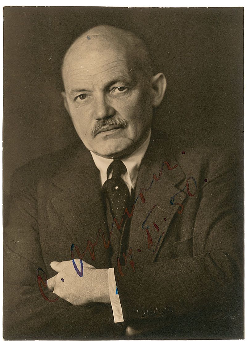 German airplane builder and founder of Dornier GmbH (1884–1969). Vintage matte-finish 3.25 x 4.5 head-and-shoulders photo, signed in fountain pen, “C. Dornier, 17-XI-50. In fine condition, with moderate contrast to signature against the dark background.