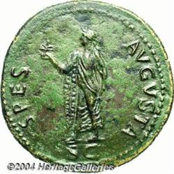 <B>Claudius.</B></I> A.D. 41-54. AE sestertius (37 mm, 27.21 g). Rome, ca. A.D. 50-54. Laureate head right / Spes walking left, holding flower and raising hem of skirt. RIC 115; BMC 192; Cohen 85. Near XF, green patina, fields smoothed. <BR><BR><B>Important notice:</B> Heritage usually auctions material at the rate of 200-250 lots per hour. On some occasions eBay Live bid software or the Internet may not be able to keep up with the pace of the auction. We recommend placing a realistic absentee bid now as insurance to avoid disappointment. Occasionally the auctioneer may eliminate or reject an eBay Live bid, and the auctioneer may also reopen a lot after the close of the eBay live bidding (usually because we missed an audience bid), and may reject your bid even if it shows you as the winning bidder. By bidding via eBay Live, you agree that Heritage may award the lot to another bidder at its sole discretion under the circumstances described above or any other reasonable circumstances. Since eBay bids are not shown to us until we open the lot on the floor, we treat those bids just like floor bids. In most cases the floor responds before the eBay bid is presented to us, due to Internet lag time, so for consistency we have made it a policy that floor bids are always considered first over tie eBay live bids. Also please note that all Heritage lots purchased through eBay Live carry a 20% Buyer's Premium. Please make sure you read the Terms and Conditions before you bid.