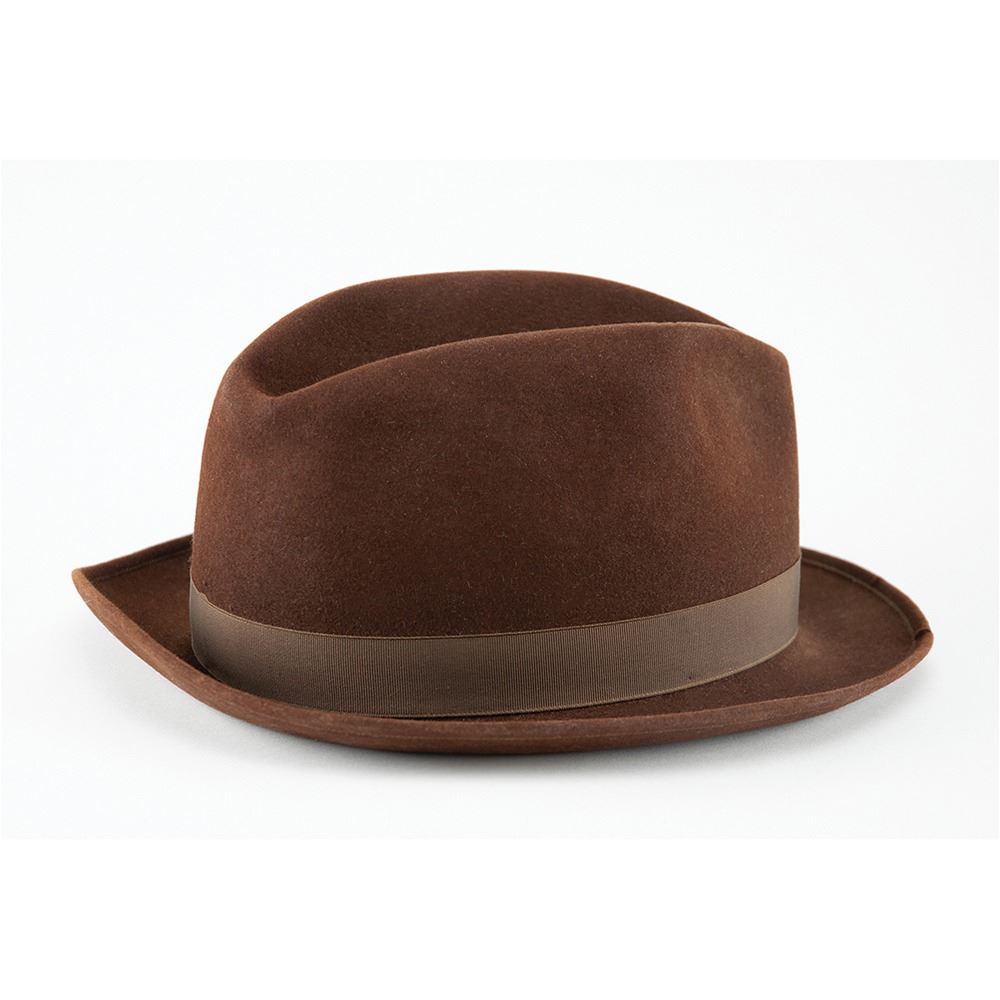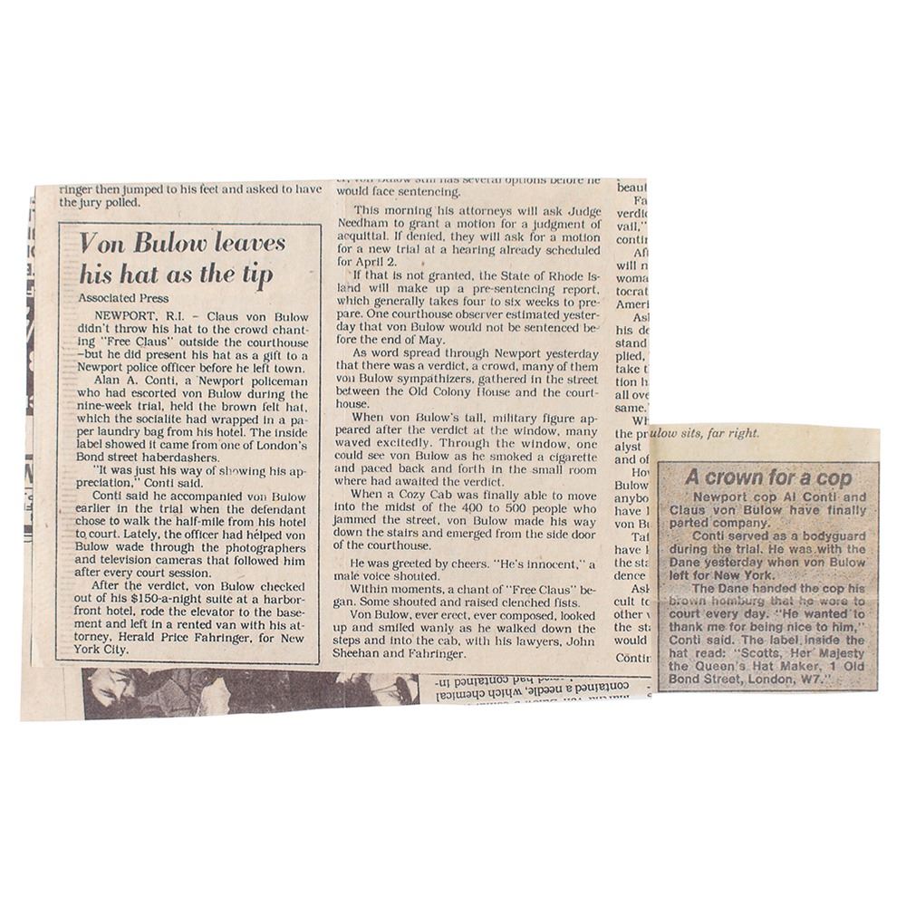 Accompanied by a photo of von Bulow wearing the hat outside the courtroom, as well as various newspaper clippings related to von Bulow’s initial guilty charge and 30-year sentence, which features a short article from the March 17th edition of the Boston Globe with the headline: “Von Bulow leaves his hat as the tip.†The article, in part: “Claus von Bulow didn’t throw his hat to the crowd chanting ‘Free Claus’ outside the courthouse—but he did present his hat as a gift to a Newport police officer before he left town. Alan A. Conti, a Newport policeman who had escorted von Bulow during the nine-week trial, held the brown felt hat, which the socialite had wrapped in a paper laundry bag from his hotel."