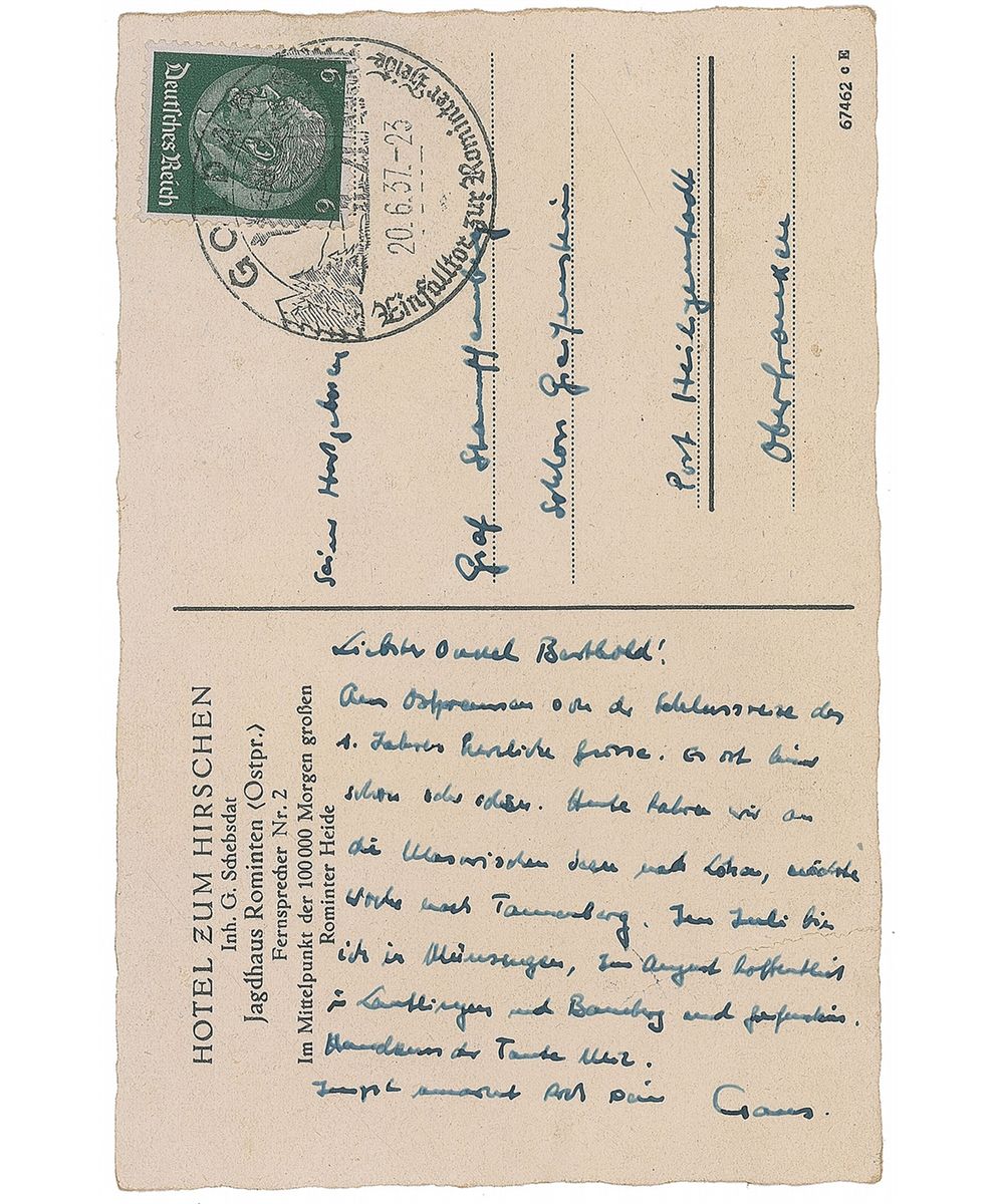 German officer (1907–1944) who was one of the leading members of Operation Valkyrie. He was executed by firing squad after the operation failed. Extremely rare ALS in German, signed “Claus,” one page on a 5.5 x 3.5 postcard from the Hotel Zum Hirschen depicting a majestic stag sculpture, postmarked June 20, 1937. Letter to his Uncle Berthold. In full (translated): “Greetings from East Prussia. We are on our final trip of the first year. It is really beautiful here. Today we shall travel to the Masurian Lakes near Lötzan, next week will take us to Tannenberg. During July, I expect to be in Münsingen, hopefully in Lautlingen, Bamberg and Greifenstein in August.” Stauffenberg also addressed the postcard on the right side, incorporating “Count Stauffenberg.” In fine condition, with a light unobtrusive crease to the corner near the signature. At the beginning of 1937, Stauffenberg was promoted to a captain in the cavalry.
