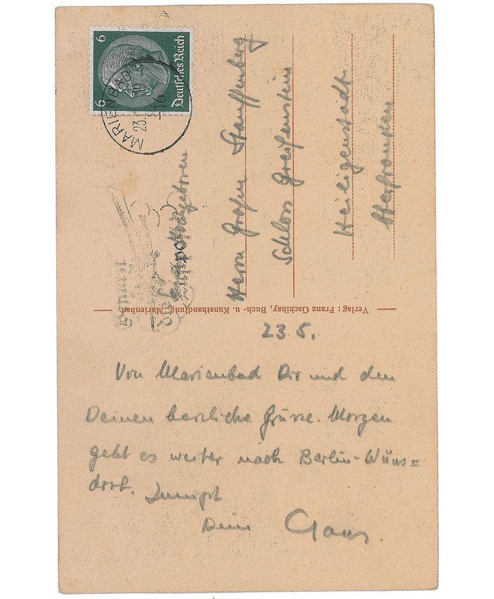 German officer (1907–1944) who was one of the leading members of the failed plot to assassinate Adolf Hitler as part of Operation Valkyrie. He was executed by firing squad after the failure of the operation. ALS in German in pencil, signed “Claus,” one page on a 5.5 x 3.5 postcard depicting Hotel Carlton, May 23, 1939. Letter to his uncle, Berthold F. L. M. F. Schenk von Stauffenberg, sending greetings from Marienbad and announcing his continuation of the journey to Berlin. In fine condition.