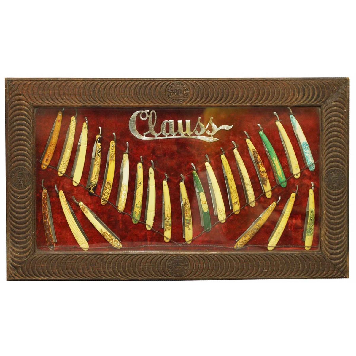 Original wall hanging "Clauss" Fremont, Ohio straight razor country/hardware store display case displaying 24 very ornate fancy celluloid handled straight razors. Very good condition. 29.5"Wx17.5"T.