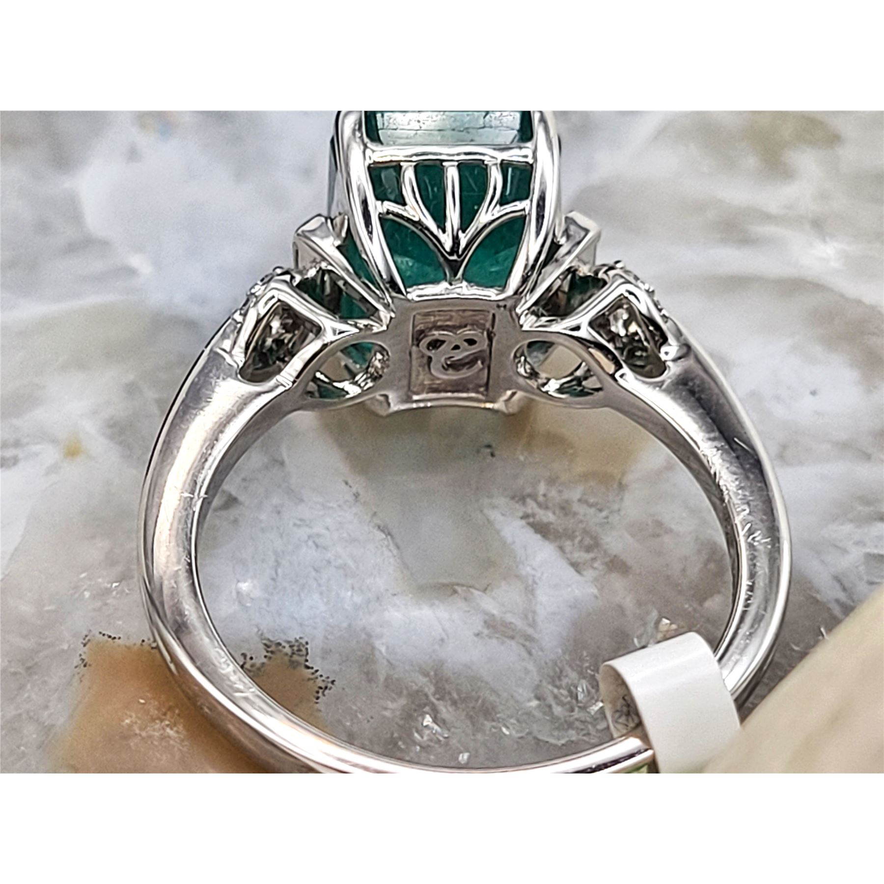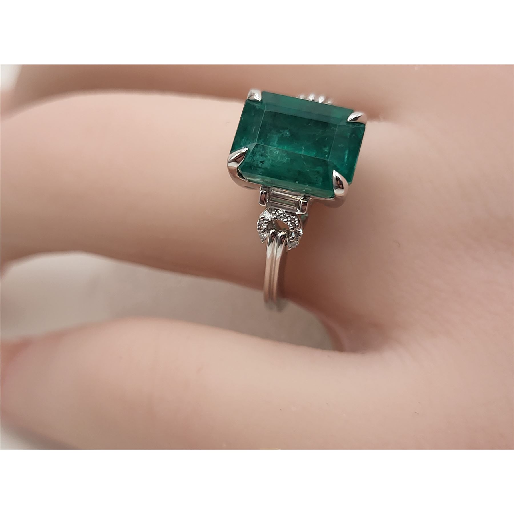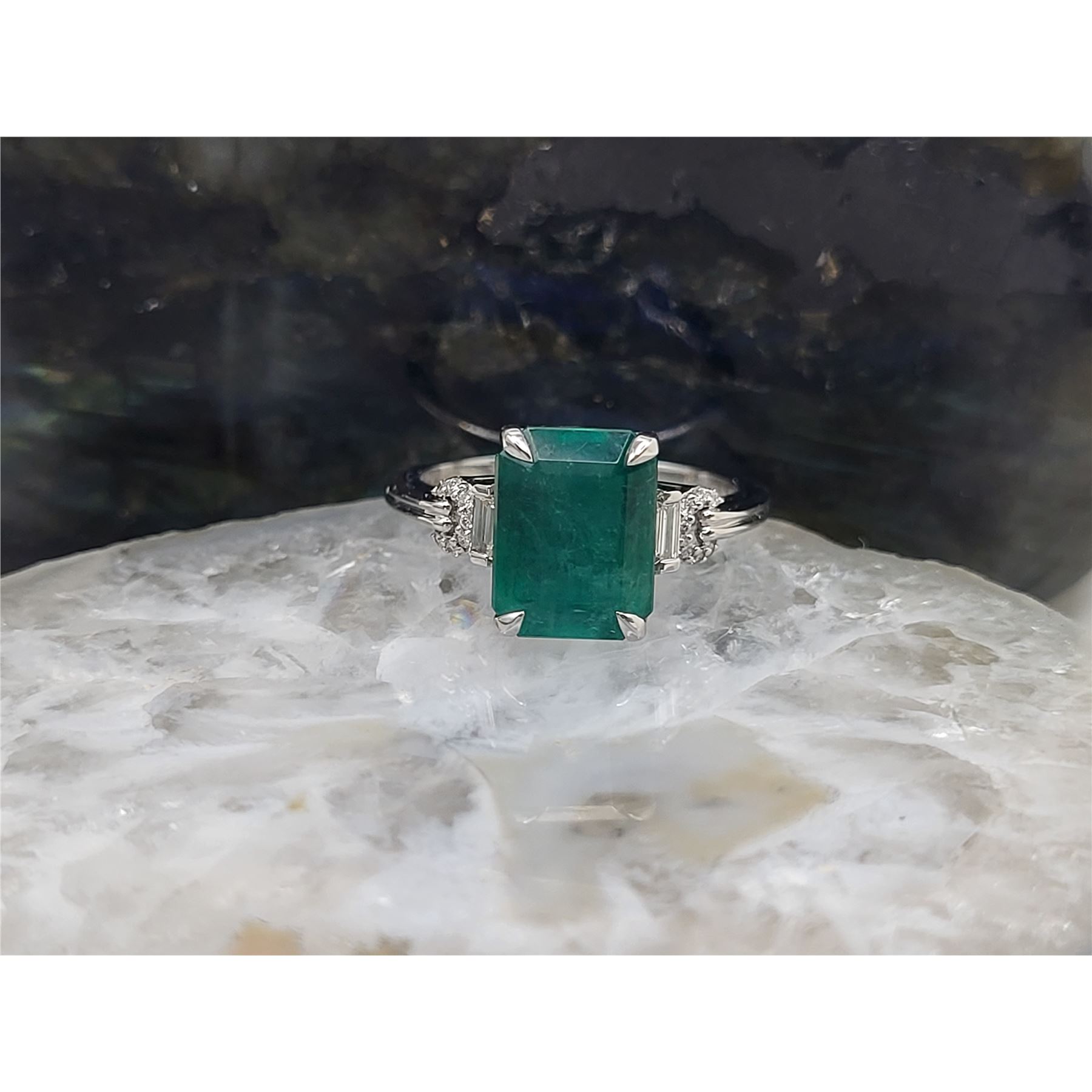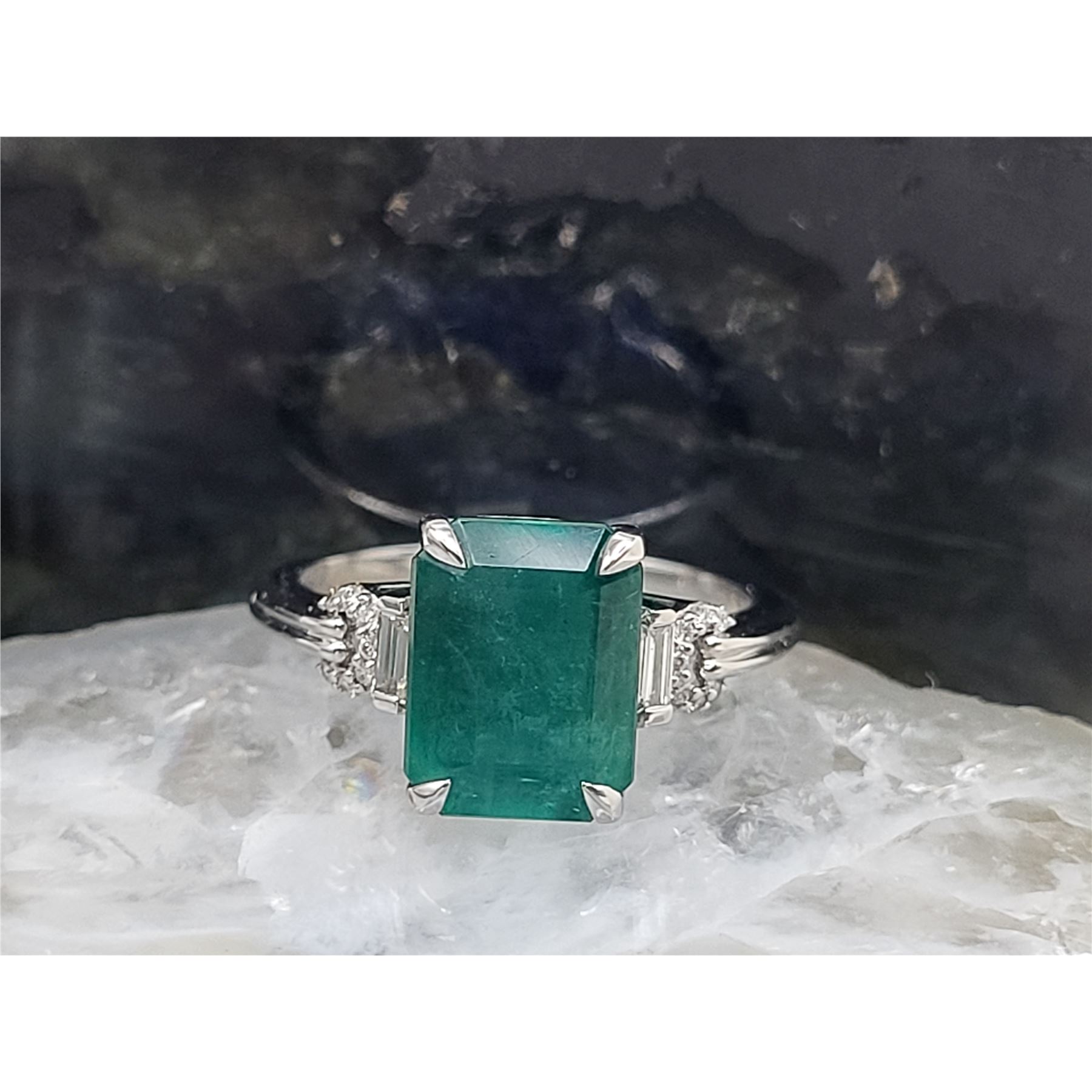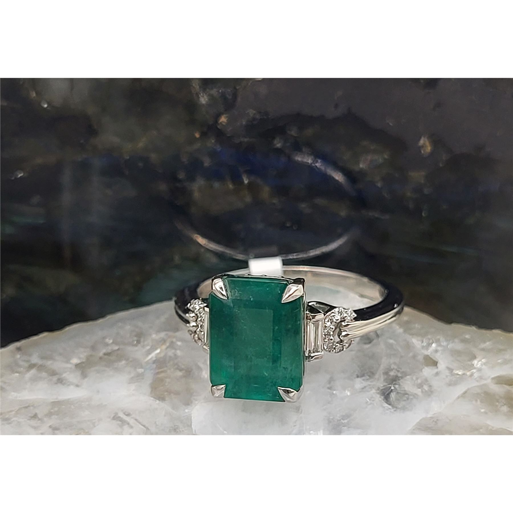 A striking design in 18K white gold, size 7, showcasing a vivid 4.98 ct octagon-cut emerald held securely in claw prongs. The emerald’s rich green hue is enhanced by .14 ctw of baguette and round brilliant-cut diamonds (G color, SI1 clarity), adding refined sparkle to the composition. The supportive under gallery ensures both comfort and stability, while the “bridle” style lends a distinctive architectural elegance. A rare and sophisticated piece for the collector who values bold design and timeless gemstones. See sizing details and other information below . AdminCode: 6282/21-begg