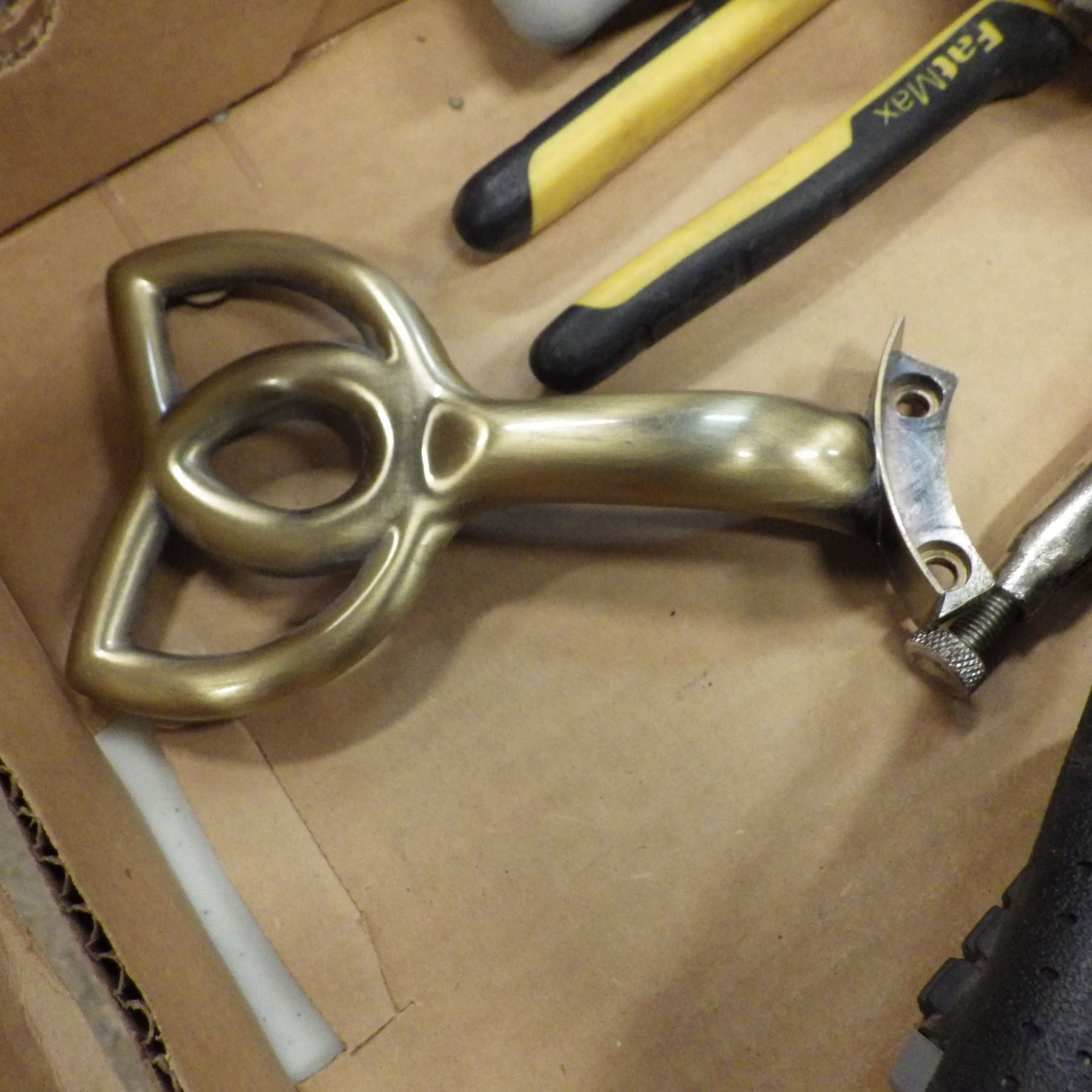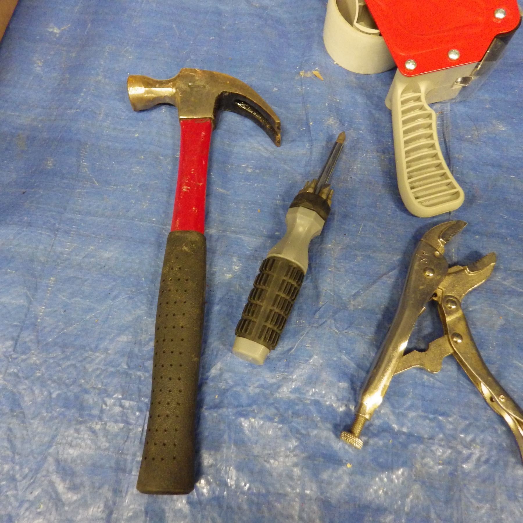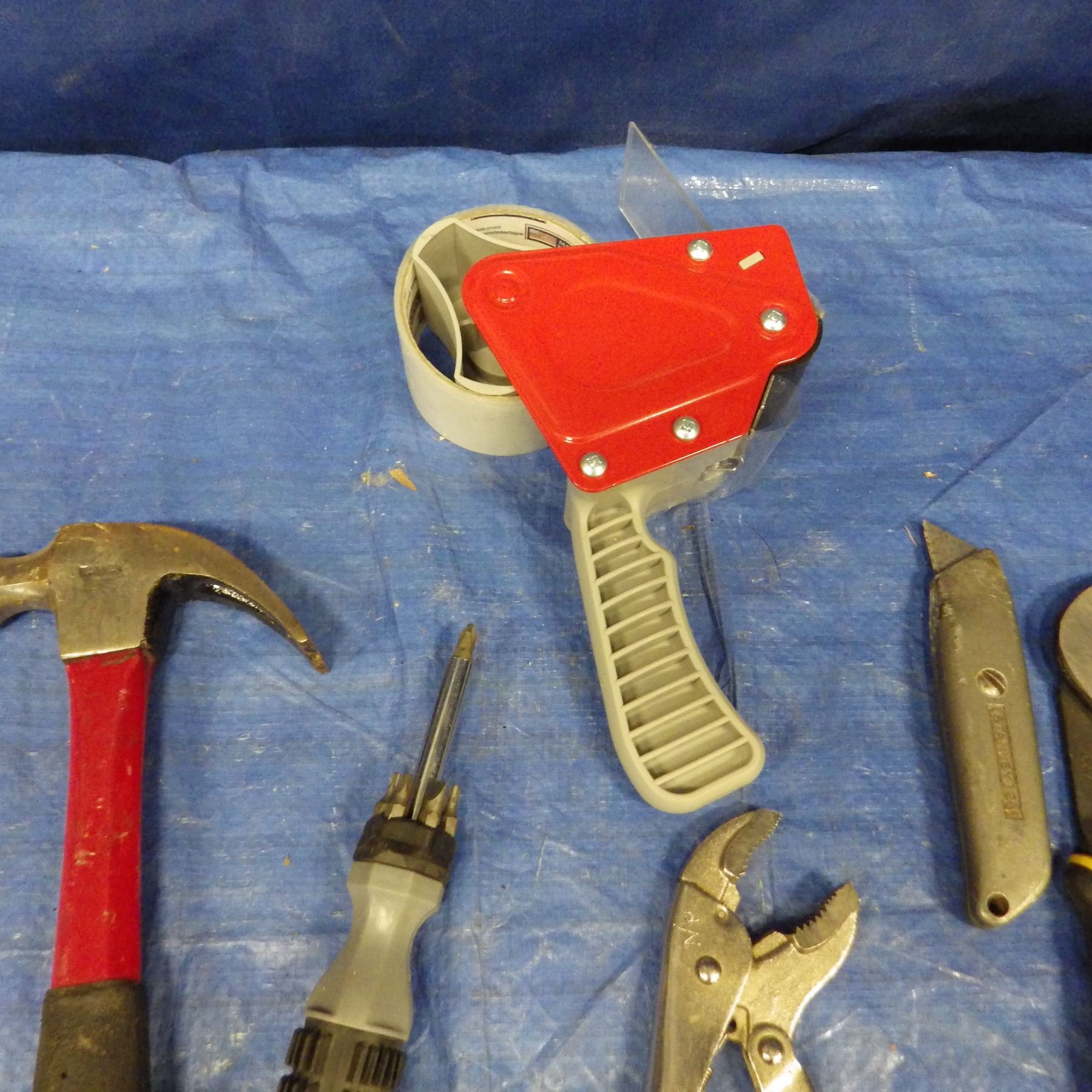 Claw hammer, Carton tape dispenser, ceiling fan arm blade, vice grips, multi bit screwdriver, Stanle