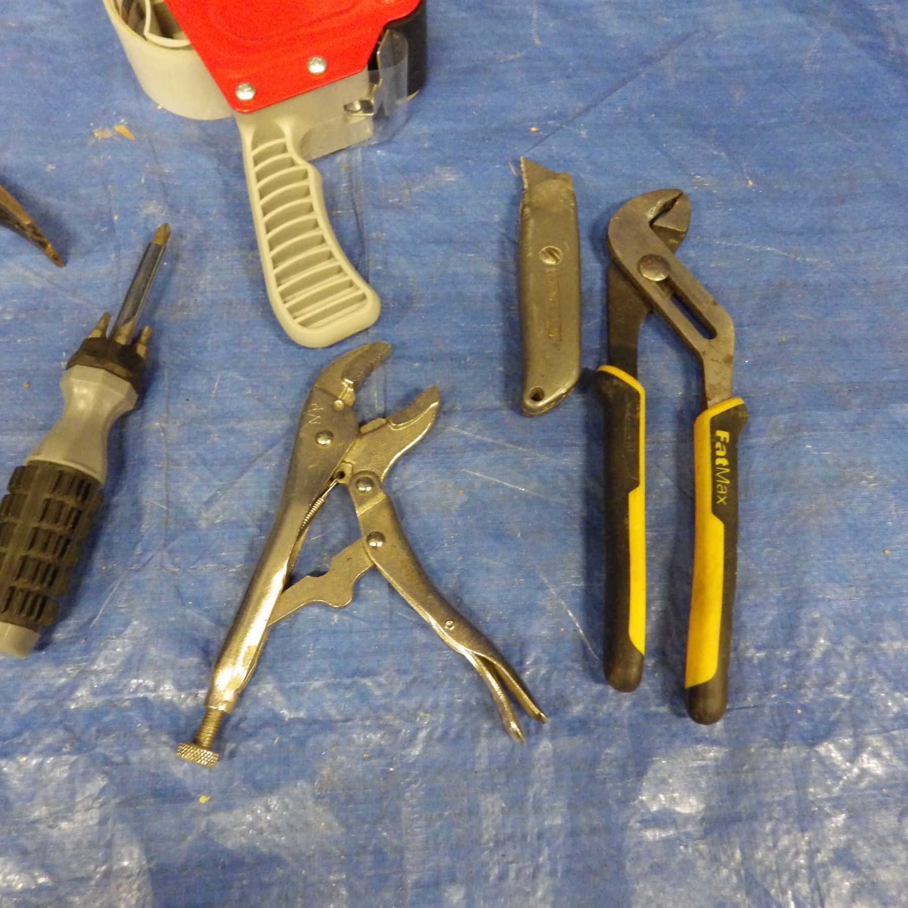 Claw hammer, Carton tape dispenser, ceiling fan arm blade, vice grips, multi bit screwdriver, Stanley utility knife, fat Max adjustable pliers