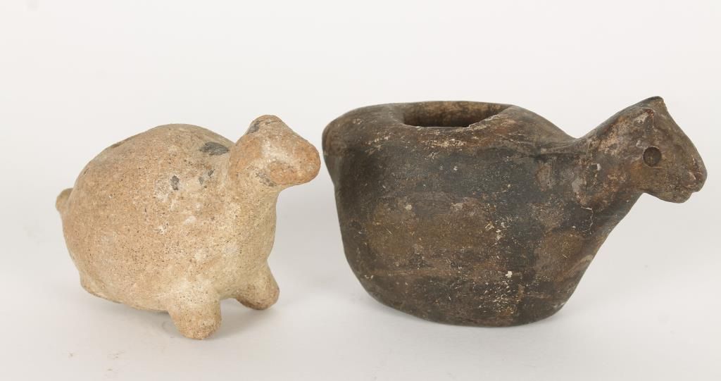 (2) Pre Columbian effigy clay figurines. Both animal figures. (1) Most likely a paint cup or oil burner 3" long x 2" tall x 1-3/4" wide. (1) Most likely an incense burner 3-3/4" long x 2" wide x 2" tall. Back legs missing. Both excavated Yucatan Peninsula 1940's. Collection of (33) Clay beads, excavated in Central America in the 1940's. Average size 3/4" diameter. Some plain, some with carved designs. Mostly black with a few brown and (1) white bead.