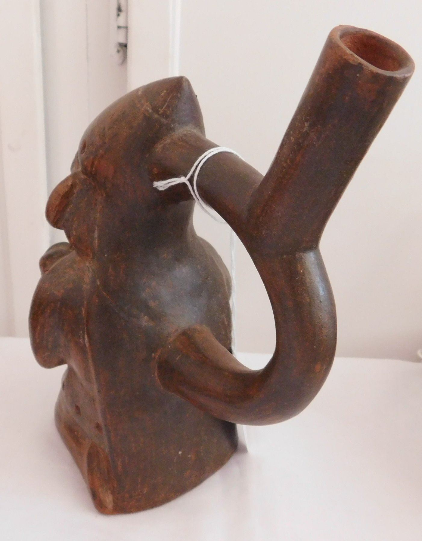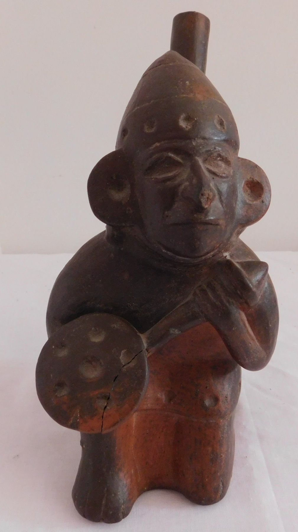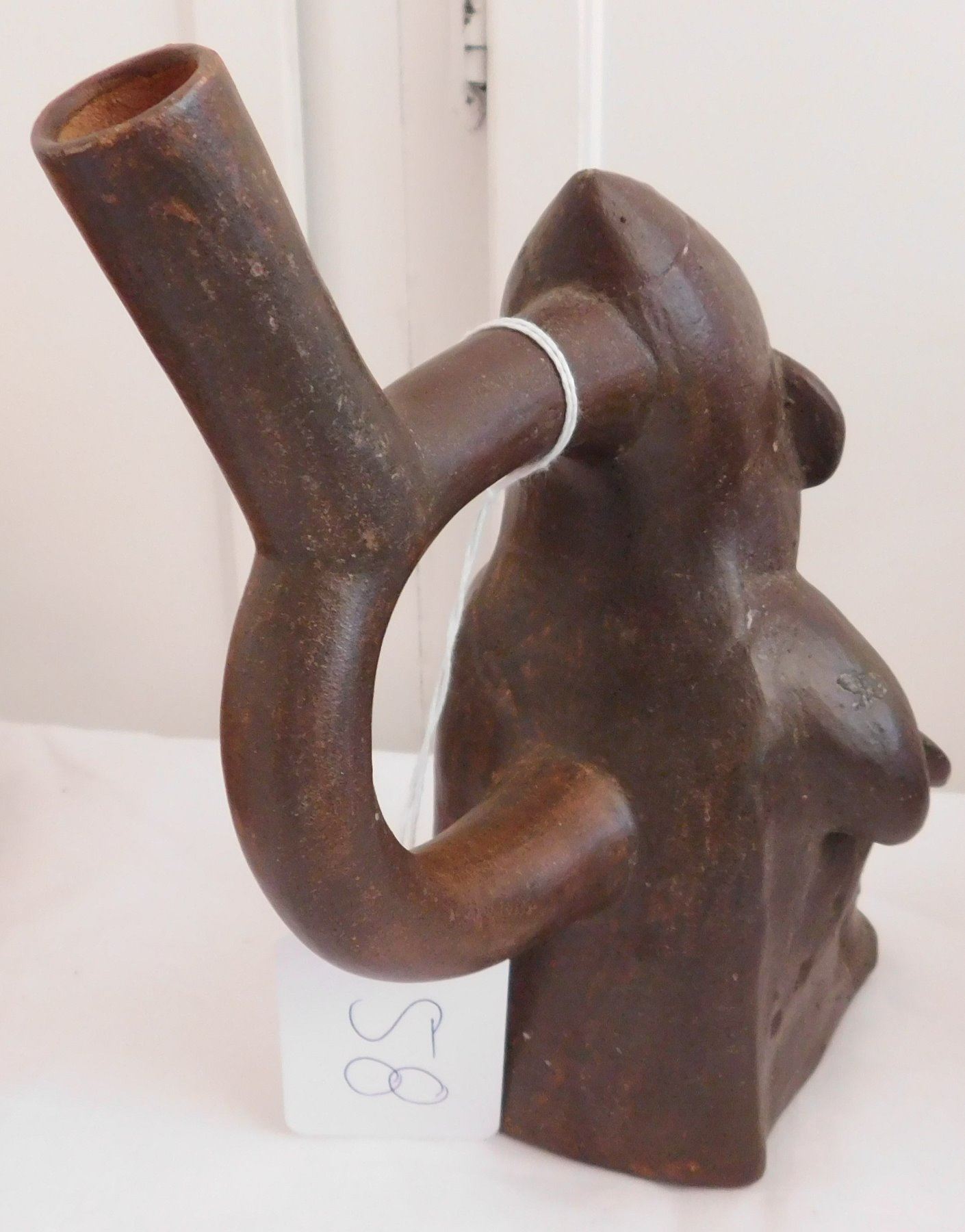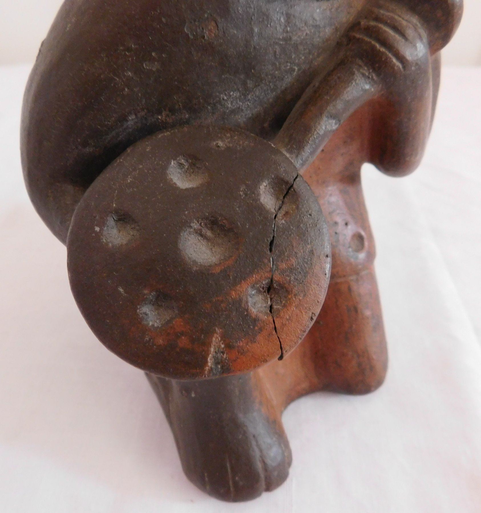 Clay Figure, age unknown. Made of clay and paint, the item measures 4.5" x 7" x 9". South America. Nice, older vessel with handle and spout, appears to have been used for drinking. Condition: Crack & repair, see images. Shipping: $24.50 w/insurance and signature.