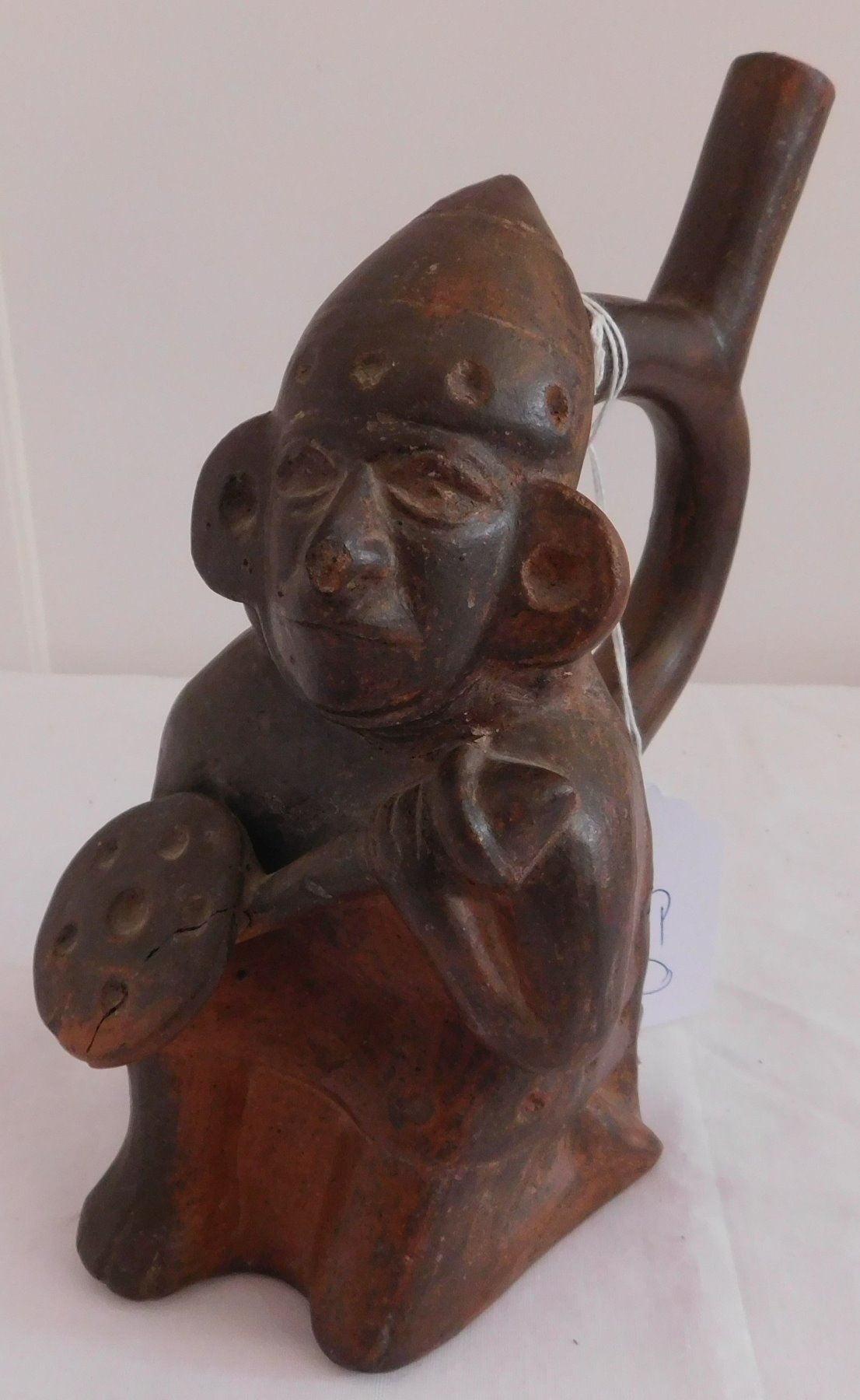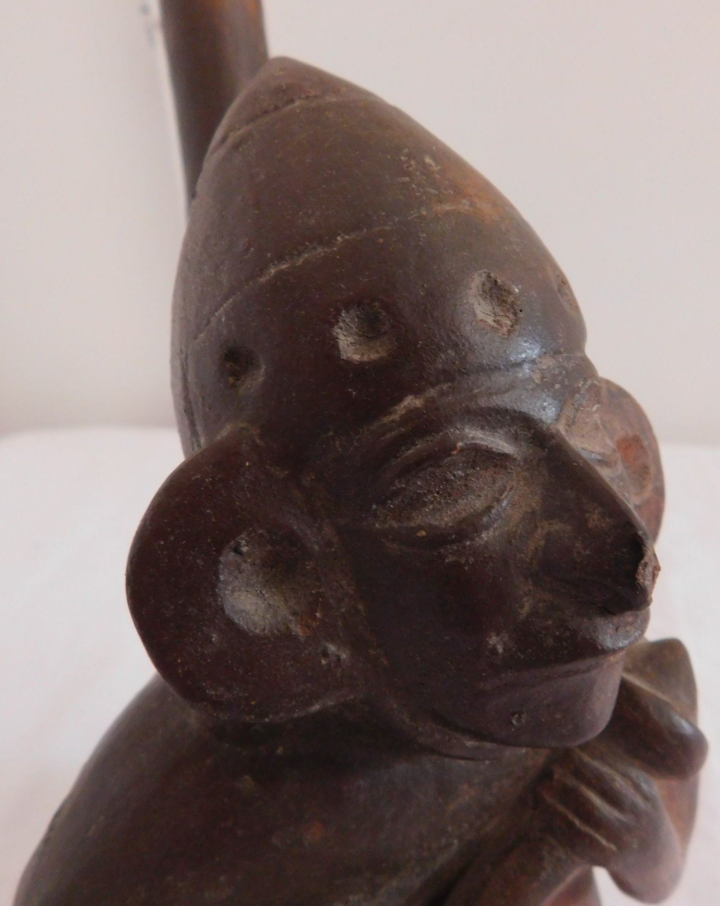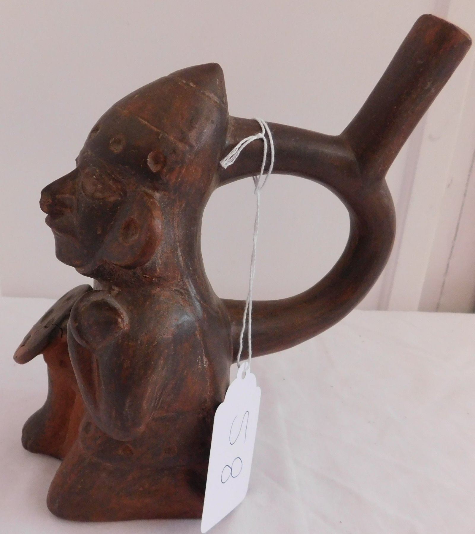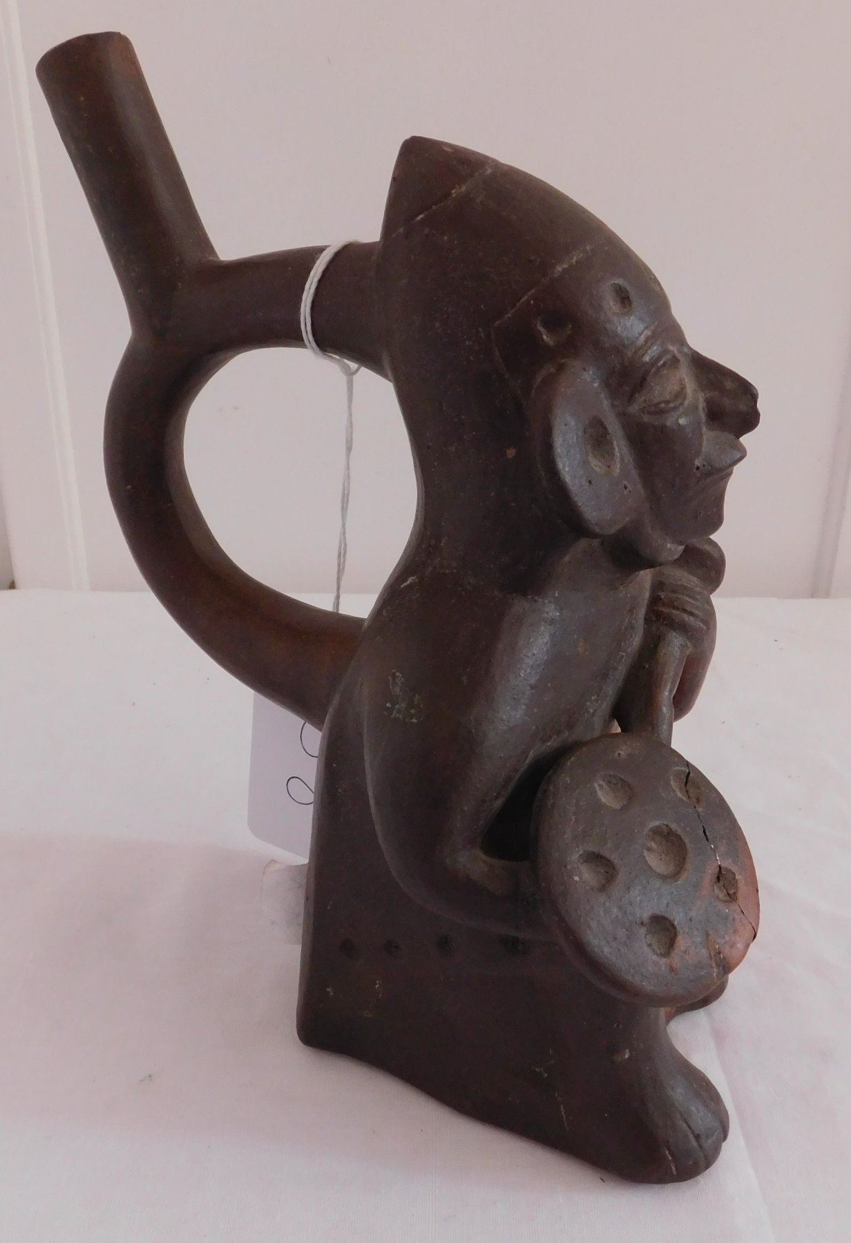 Clay Figure, age unknown. Made of clay and paint, the item measures 4.5" x 7" x 9". South America. Nice, older vessel with handle and spout, appears to have been used for drinking. Condition: Crack & repair, see images. Shipping: $24.50 w/insurance and signature.