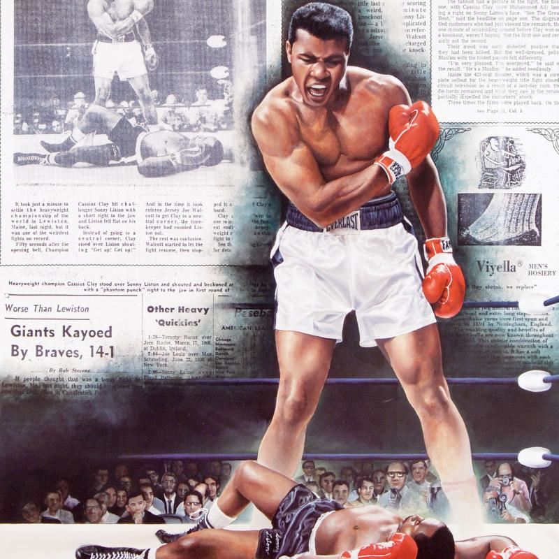 Own a piece of sports history with this Muhammad Ali and Ken Norton photo. Taken at the peak of his success as one of the greatest heavyweight championship boxers of all time, this photo is sure to complement any sports memorabilia collection. "Clay KOs Liston" is a fine art lithograph poster on paper of heavyweight champ Muhammad Ali. Measures approx. 25.5" x 37" (with border), 24.5" x 36" (image).