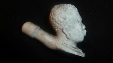 Early Clay Pipe depicting the head of Southern Slave during the 1840 to 1860 period. This pipe was unearthed at a tavern site in South Carolina and were most probably cast in the south and given to bidders at the time slave sales were routine in and