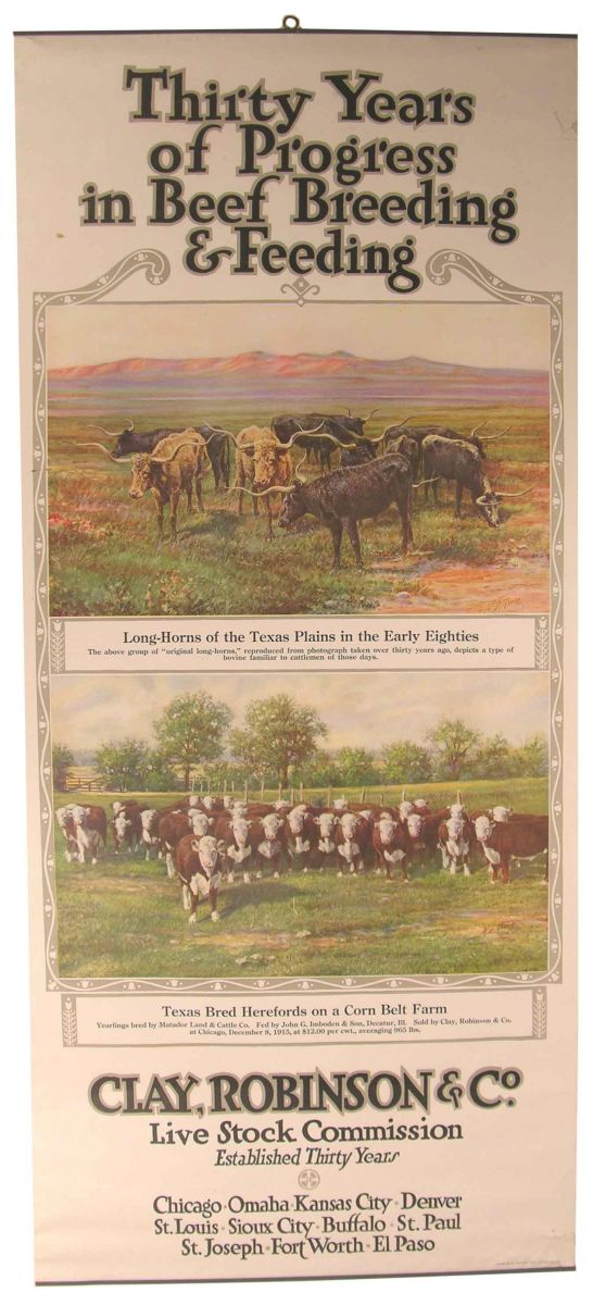 Clay, Robinson & Co. Livestock Commission Banner. 30 years of progress in Beef Breeding and Feeding. Artist N.A. Throop. Original bands top and bottom. Slight edge ware at 2/5:00 otherwise excellent condition. 16 1/2 X 38 inches. Start Price $80