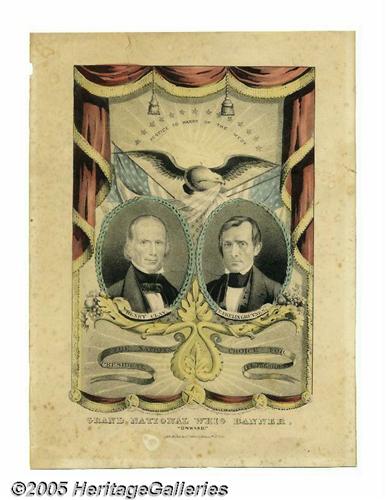 <B>Clay and Frelinghuysen Grand National Banner Print</B></I> 11" x 15" hand-colored small folio lithograph published by Nathaniel Currier in 1844, titled "Grand National Whig Banner. 'Onward.'" It depicts the Whig candidates Henry Clay and Theodore Frelinghuysen and exclaims "Justice to Harry of the West." There are a few minor border tears and light foxing. Overall condition is quite fine. It is unusual to find this print with such wide borders. Colors are strong. Lot:256
