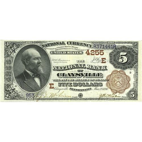 <B>Claysville, PA</B></I> - $5 1882 Brown Back Fr. 471 <B>The NB of Claysville</B></I> Ch. # (E)4255<BR>This high grade Brown Back is new to the census, and represents the highest grade large size note of any type known from this scarce western Pennsylvania institution. Pen signed <B>About Uncirculated,</B></I> a lovely note in all respects.